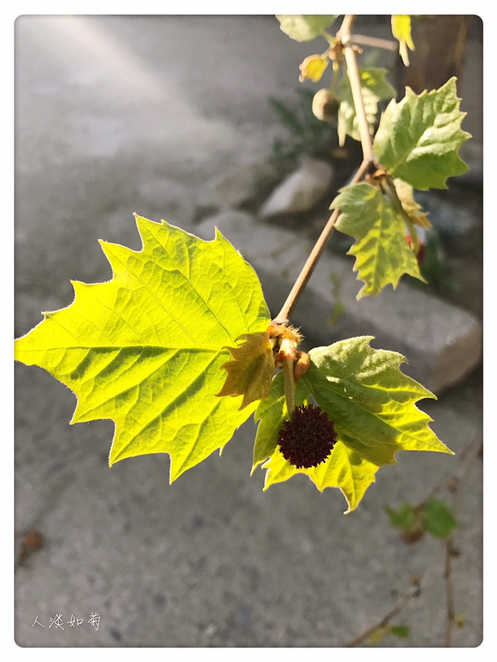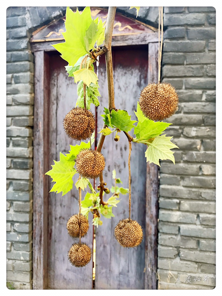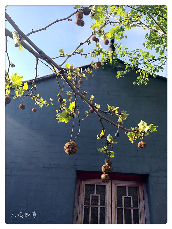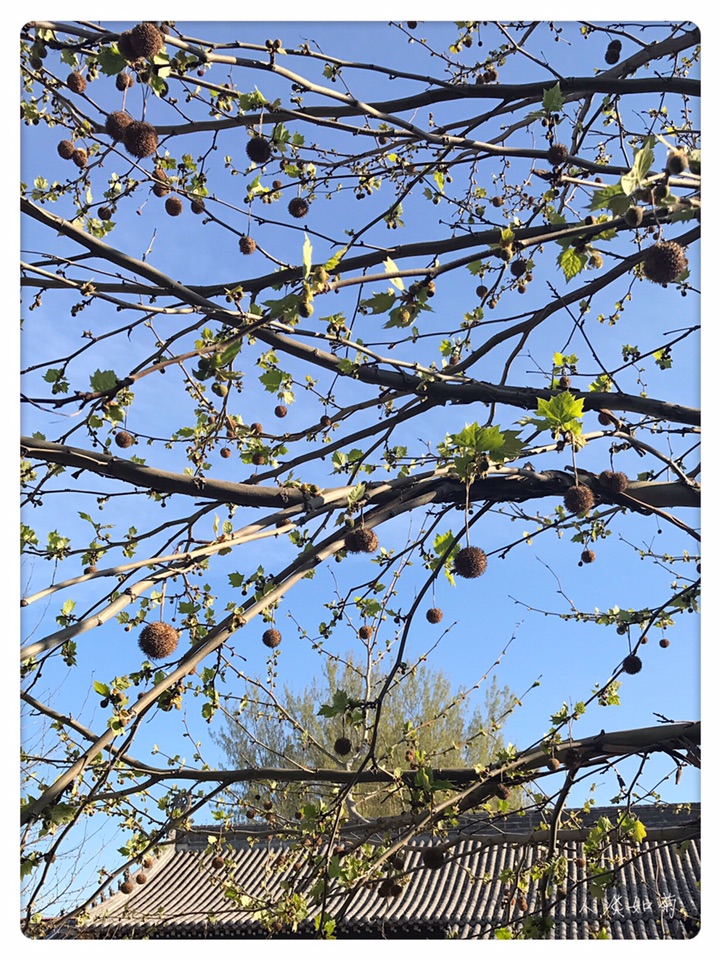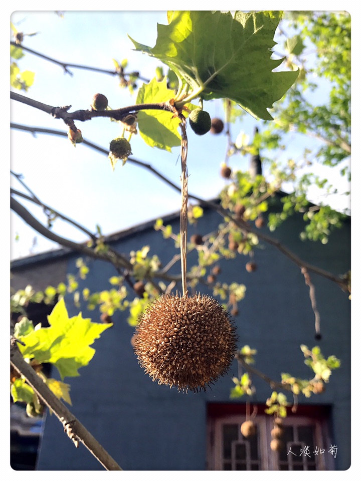 古老的院落,斜斜的夕阳,高大的悬铃木、嫩嫩的叶子,我仿佛走进了世外桃源,阳光裹在身上,微风吹拂着脸庞,静静地看着悬铃木的茎、叶、花、果实、种子、风姿,时间仿佛停止在那一刻……