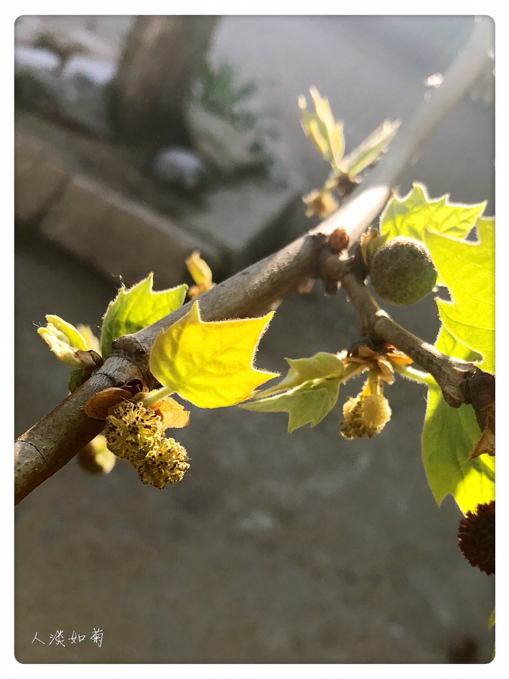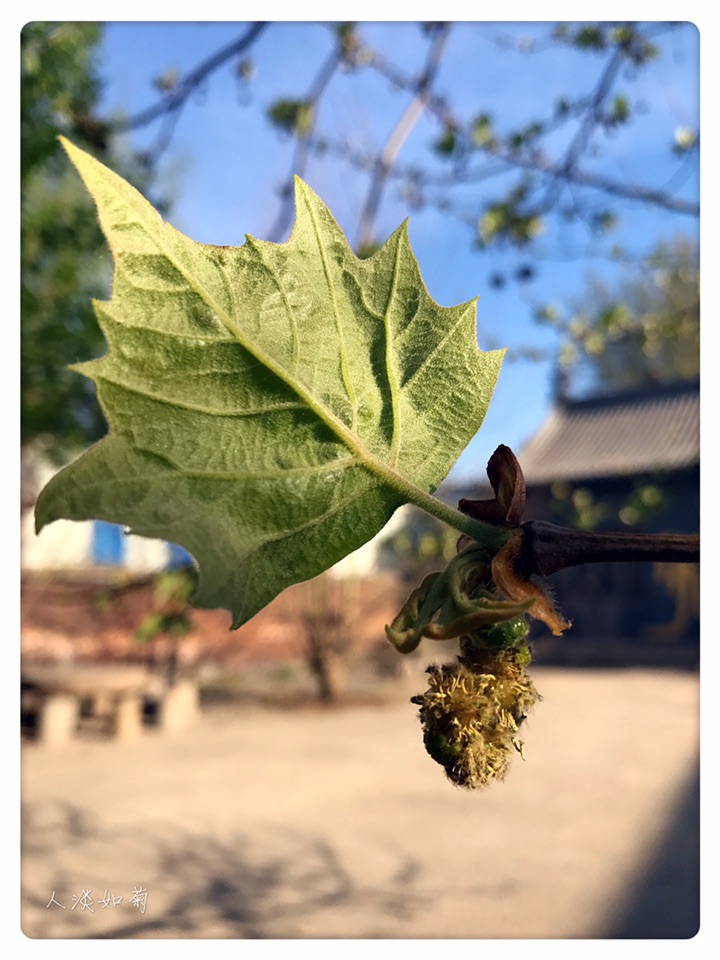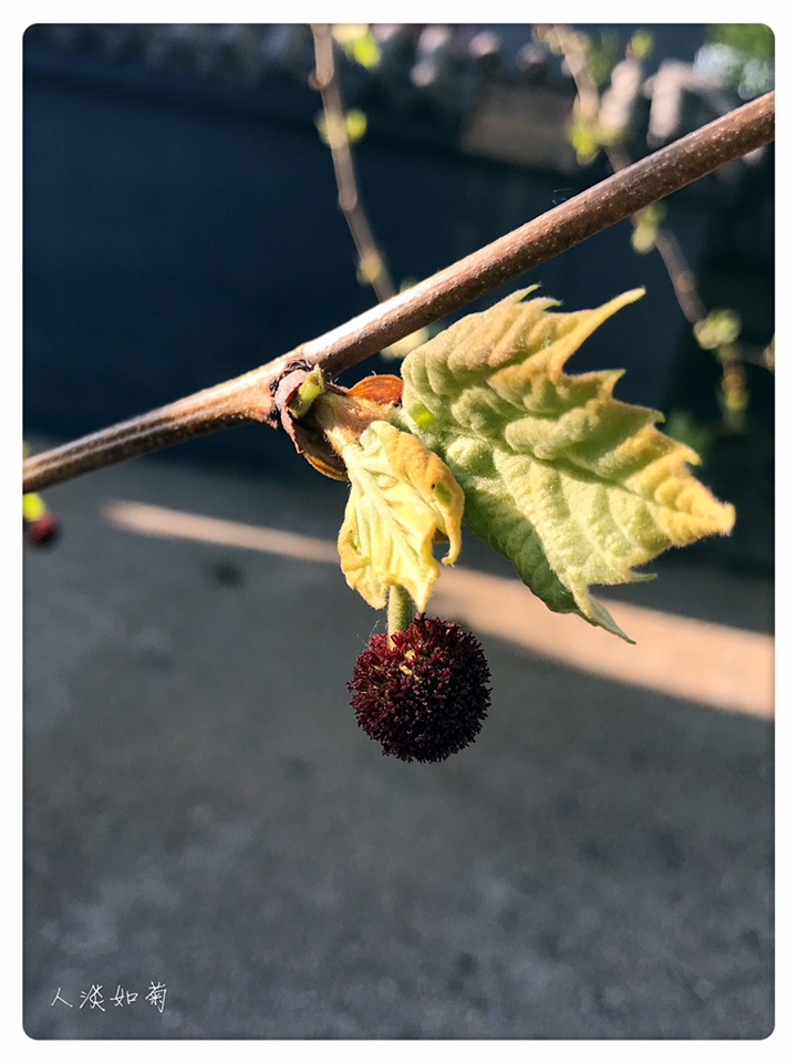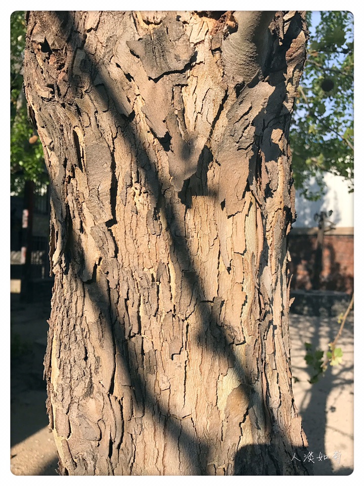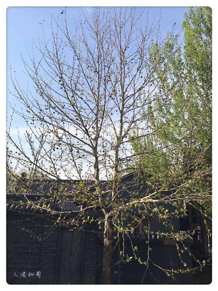 古老的院落,斜斜的夕阳,高大的悬铃木、嫩嫩的叶子,我仿佛走进了世外桃源,阳光裹在身上,微风吹拂着脸庞,静静地看着悬铃木的茎、叶、花、果实、种子、风姿,时间仿佛停止在那一刻……