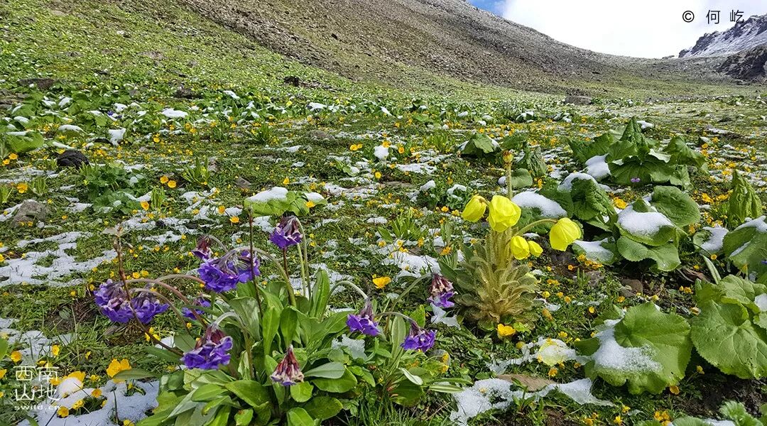 即使是夏季,积雪也不时地覆盖着草甸;在没有阳光充分照射的时候,花儿都低垂着头,显示出高原生活的不易。