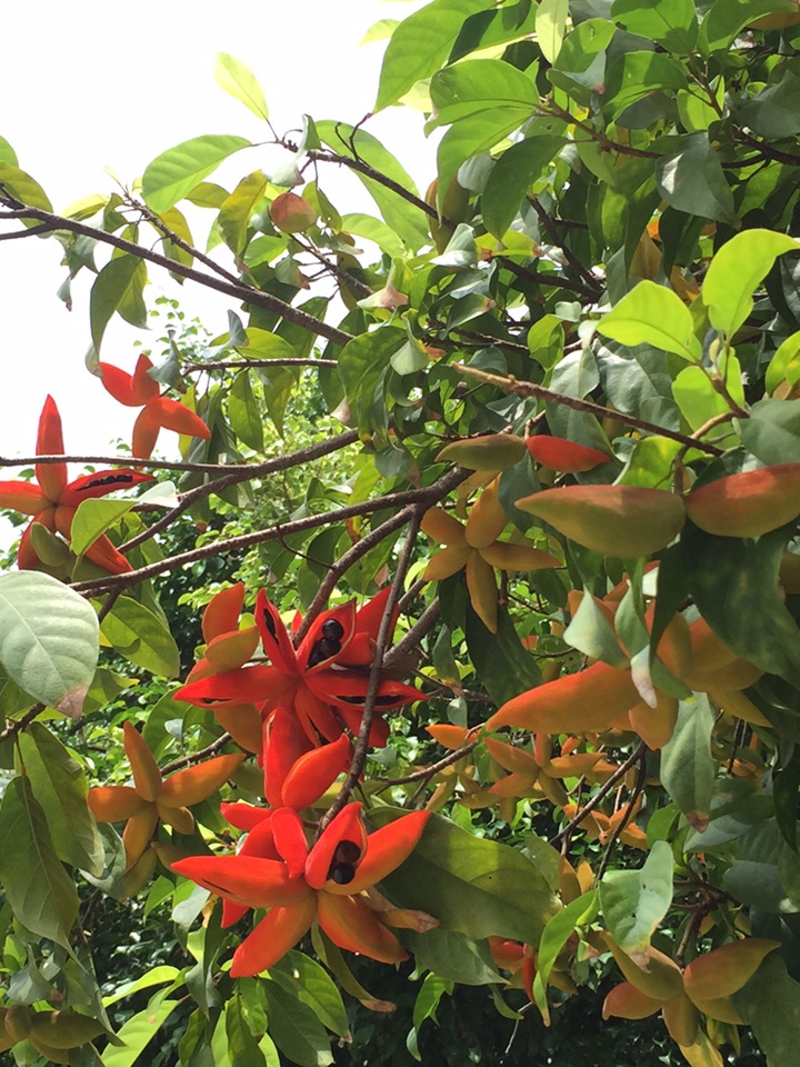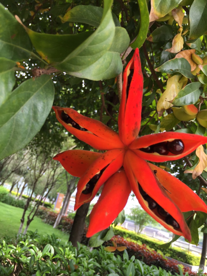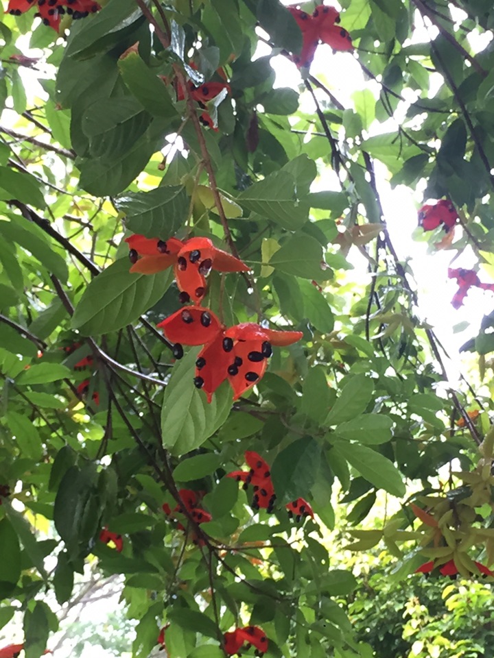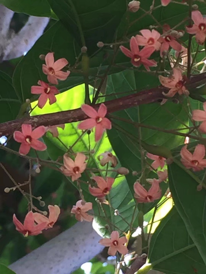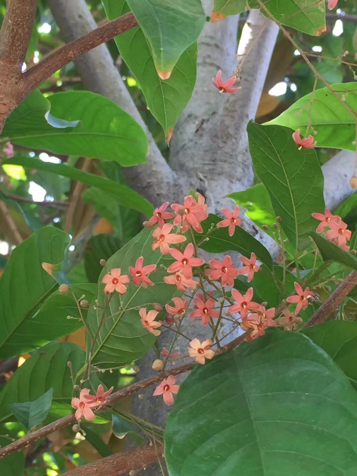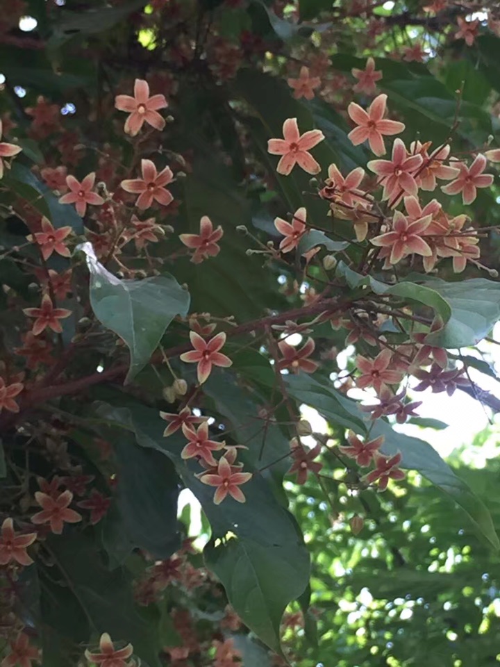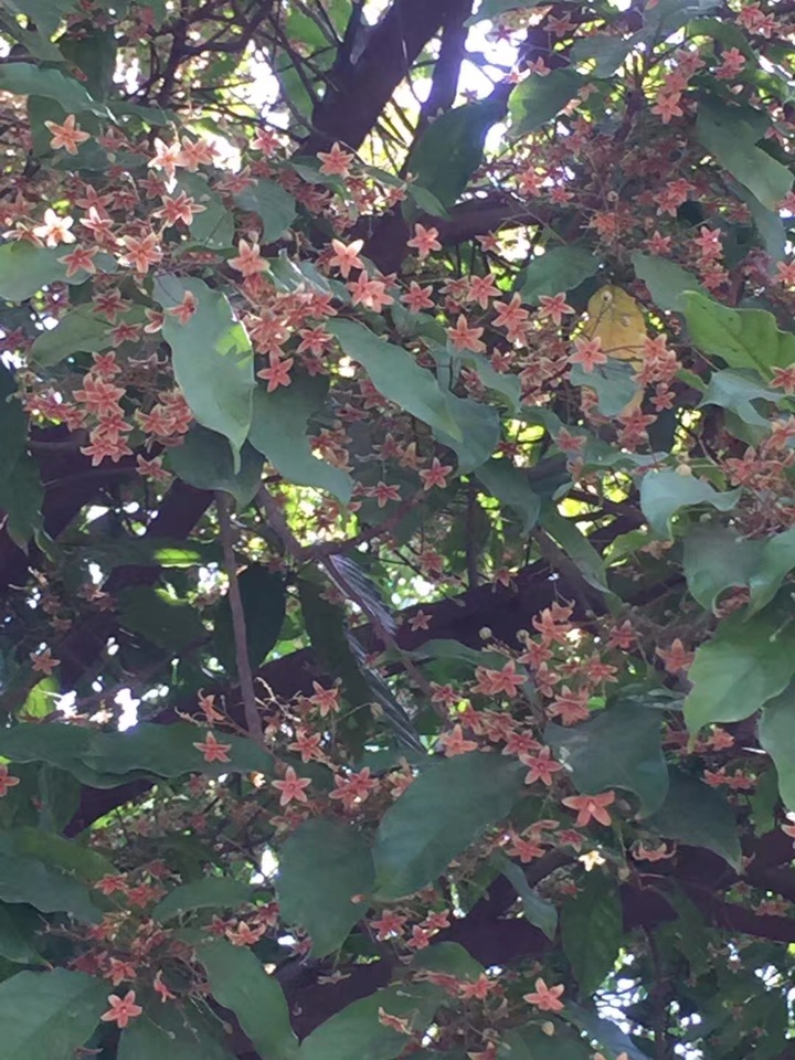 树上挂满了五星的果实,像一只只海星挂在树枝上,别有情趣。有的已成熟变红,裂开,露出果仁。