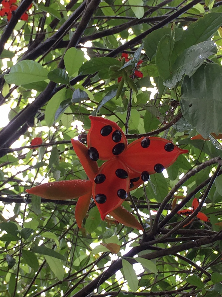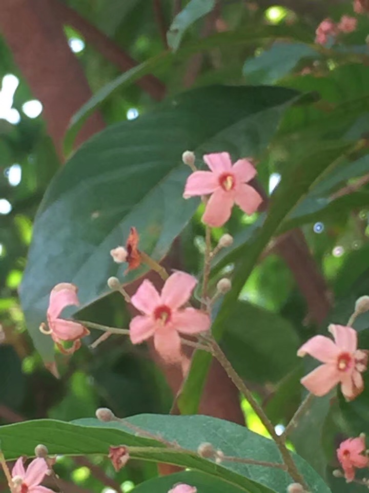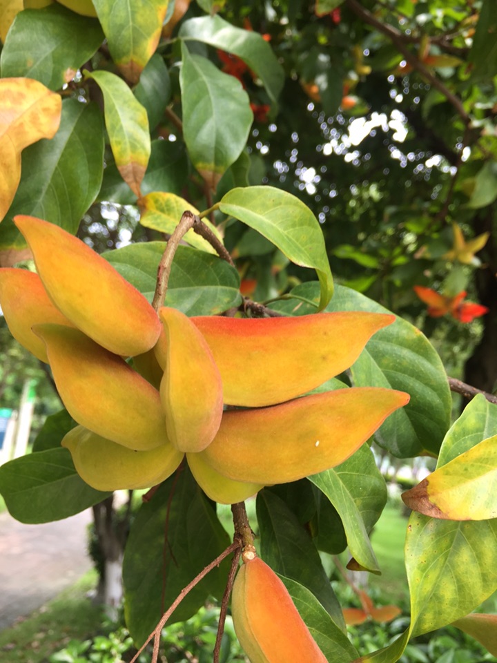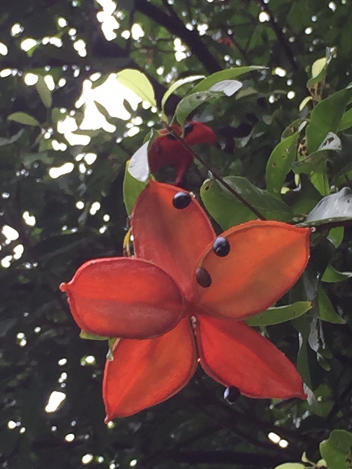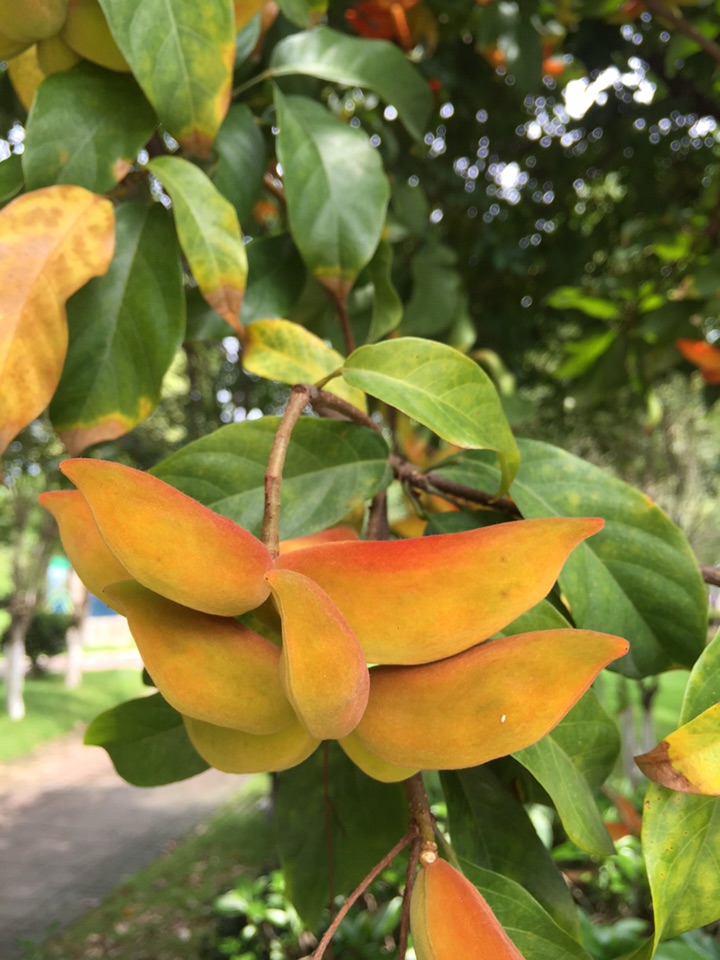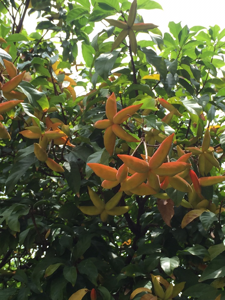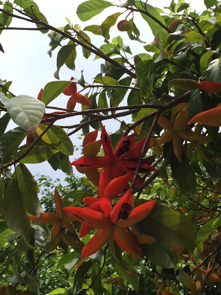 树上挂满了五星的果实,像一只只海星挂在树枝上,别有情趣。有的已成熟变红,裂开,露出果仁。