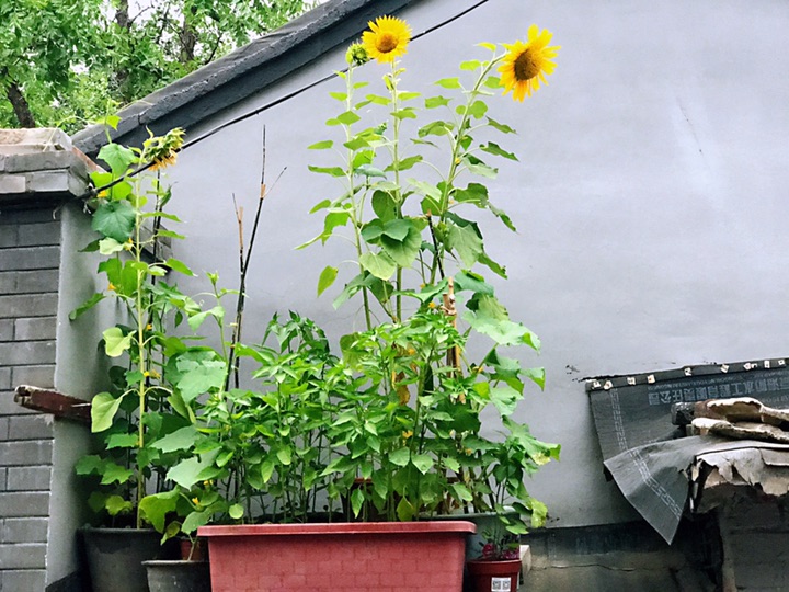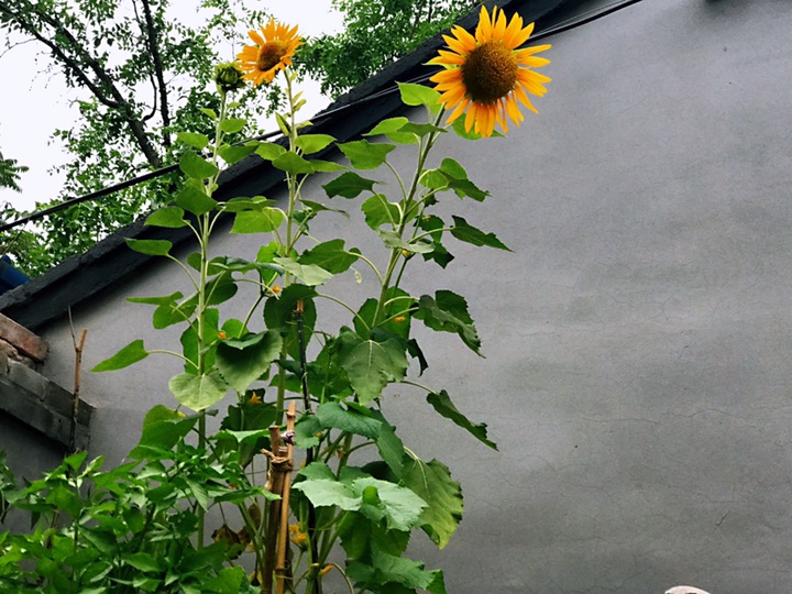 拍的时候刚好碰到向日葵的主人来给她浇水。一个很和气的大叔,看我拍的费劲,还贴心的问我要不要拿个凳子踩着拍。然后还跟我说这个就是种着观赏的,这一条胡同什么都没有看着怪没生气的,还是需要有点花花草草什么的来点缀一下。院子里还有一棵向日葵,只是连花苞都还没有起来,不然拍那一棵会好看很多。又说今天刚从这摘了2个小黄瓜,我很好奇,就向日葵底下的那几株小黄瓜苗居然都结果了,天天路过看到小黄花开,都没想到它已经结果了。大叔还特意从屋子里拿了给我看,是秋黄瓜,虽说不是很大,却也异常可爱!然后我仔细的往黄瓜苗上瞅去,想看看还有没有初长成的小黄瓜,还真找到一个,跟小辣椒似的,我兴奋的跟大叔讲。大叔告诉我,这其实是结出来的第一个黄瓜,可能是被人摸了吧,已经不长了。原来初长成的黄瓜不能摸呀,这下记住了,幸好,我对花花草草花花瓜瓜果果的从来不动手,不然可就罪孽大了……