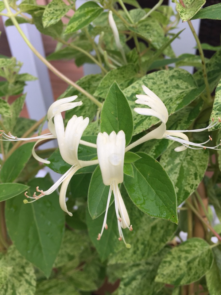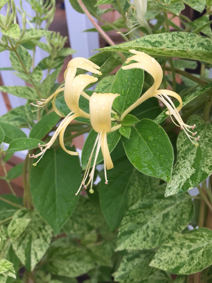 小时候,记忆中的金银花很美、很清香、很亲切 似乎很多地方都有;开春时去苗圃选花儿发现了这个 据其描述就应该是金银花了 欣喜地抱回家、满怀希望地种下... 可怎么看也找不到记忆中的那个样子、那种感觉 其藤其叶都不像以前那样的 好在现在开花了金银两色如约而至、花姿清凌飘逸、淡淡雅雅的似乎弥漫着幽幽的香味 也是美美的! 看来真是一方水土养育一方花草呀 各有其特点