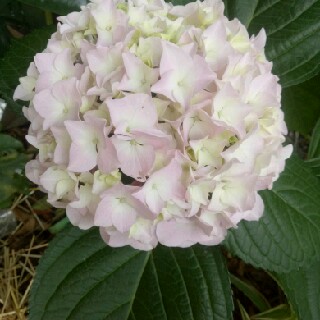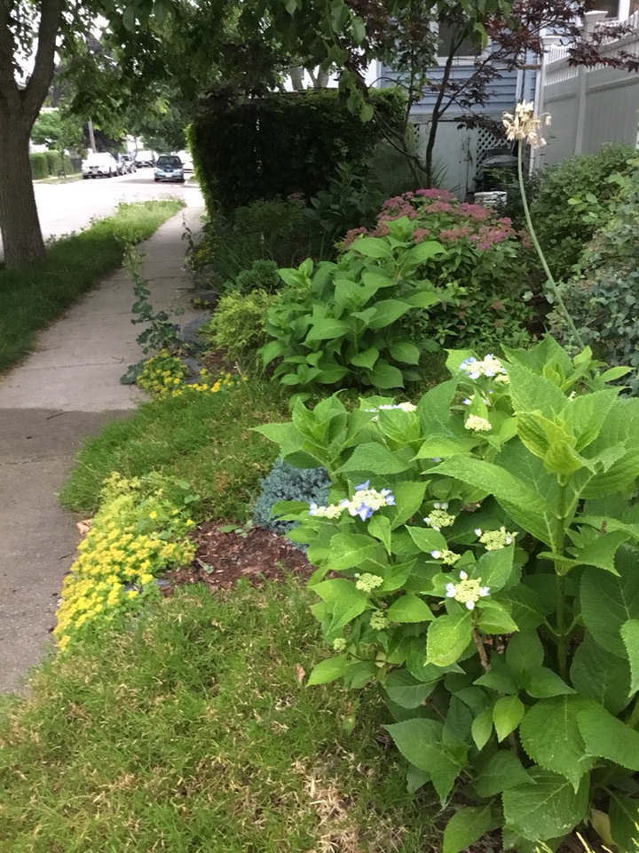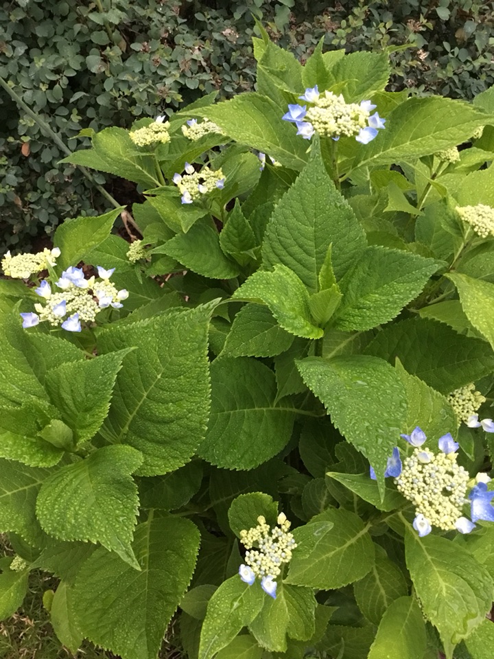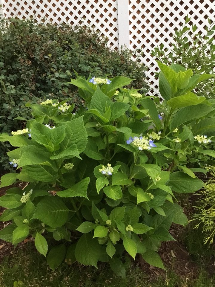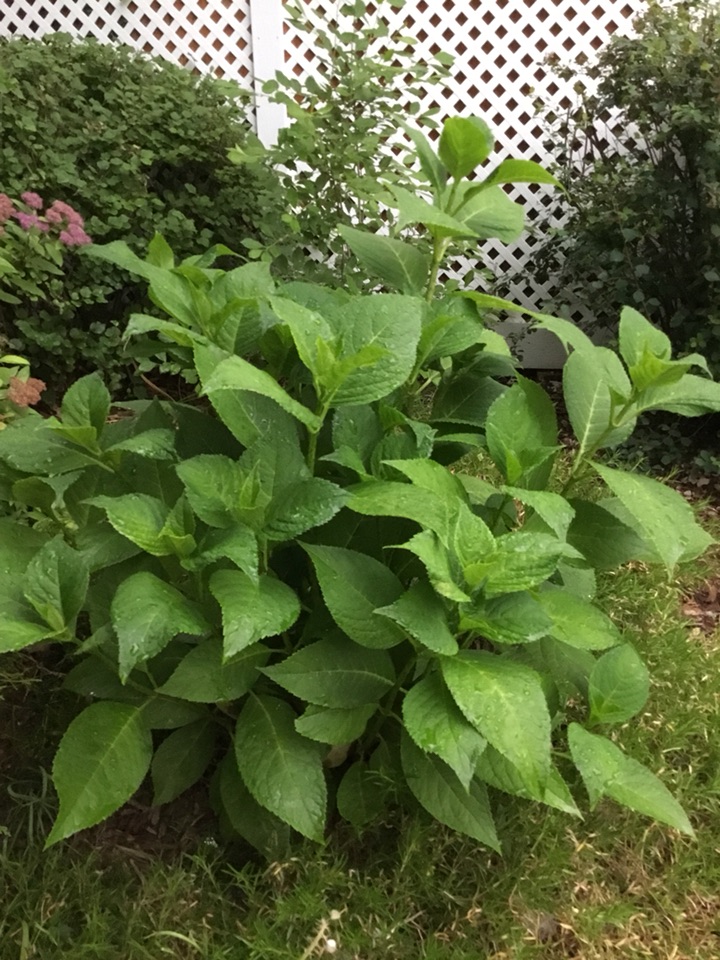 两颗八仙花一颗长满了花骨朵,一颗绿油油的枝条没有花骨朵。