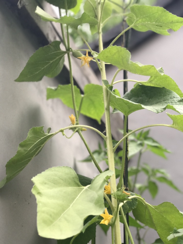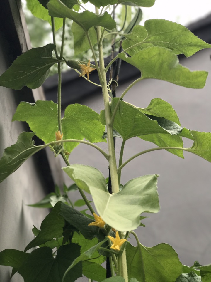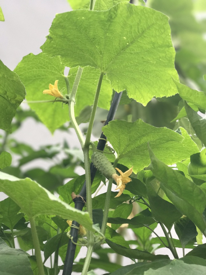 这小黄瓜长得还真是快呢,前两天拍向日葵的时候都没有注意到有小黄瓜探出脑袋来,现在看到好几个呢!小小的屁股上还带着花,煞是可爱!