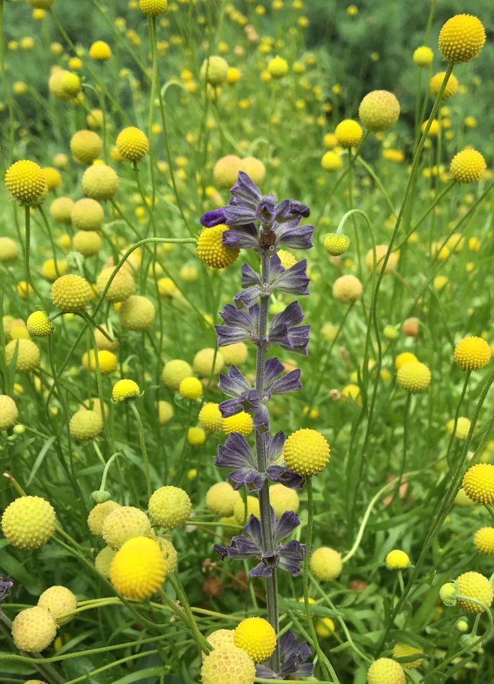 这个搭配怎么样?黄色的芳香堆心菊和紫色的鼠尾草,前些日子在北京植物园拍到的。