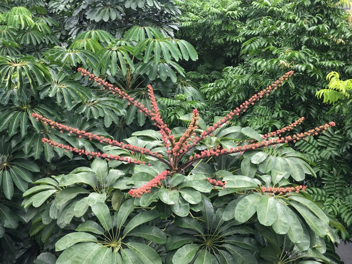 实际上澳洲鸭脚木我早就见过,是在大鹏的酒店外面,高高的,很神秘,照不到所以不知道是什么,没想到这次在深圳北站坐地铁上桥的时候居然看到了,站在桥上,正好看到树顶,照相正合适。😊