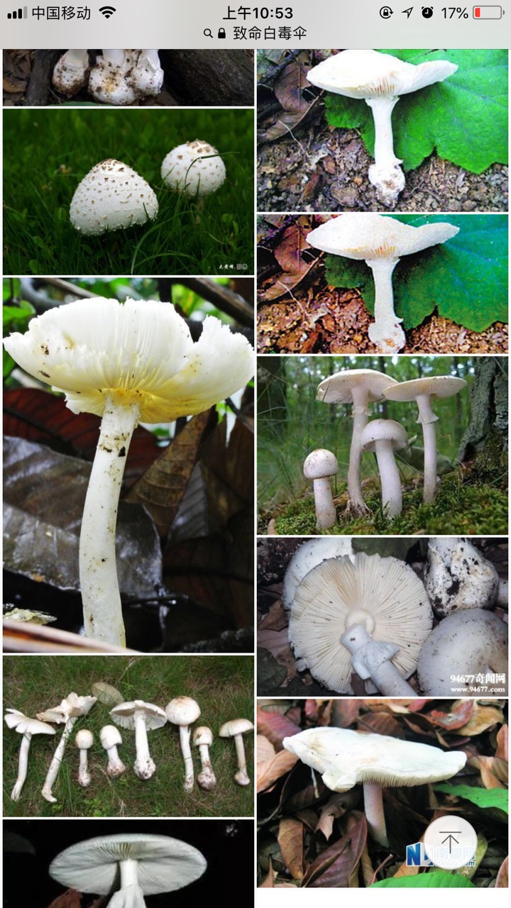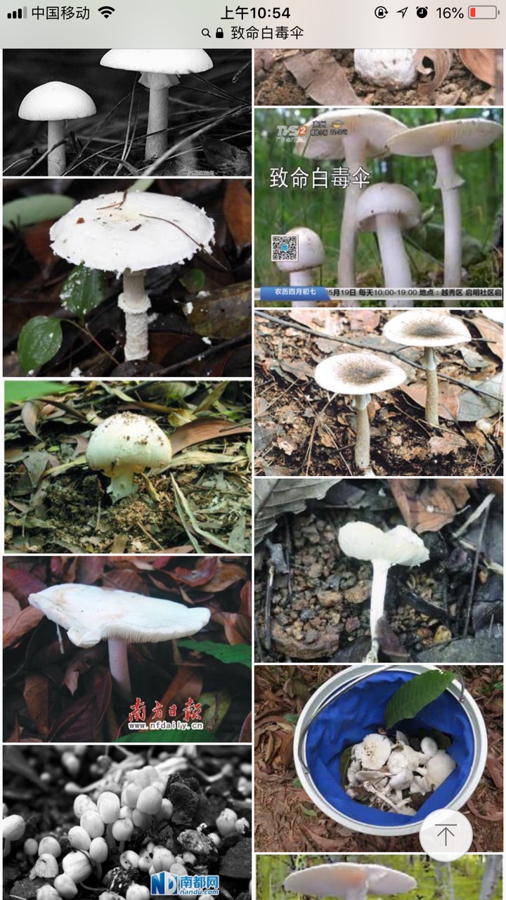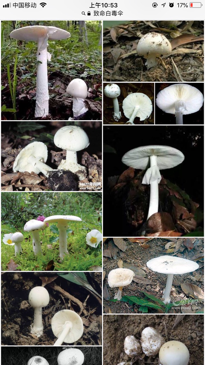 致命白毒伞(Amanita verna),又名致命鹅膏菌;白色,菌体幼时卵形,后菌盖展开成伞状;分布在广州、清远、肇庆等地;剧毒,其毒素主要为毒伞肽和毒肽类,在新鲜的蘑菇中其毒素含量甚高。这些毒素对人体肝、肾、血管内壁细胞及中枢神经系统的损害极为严重,可致使人体内各器官功能衰竭而死亡,死亡率高达95%以上