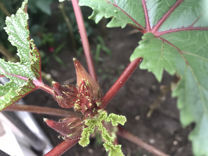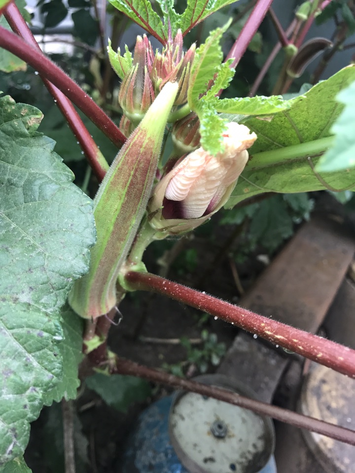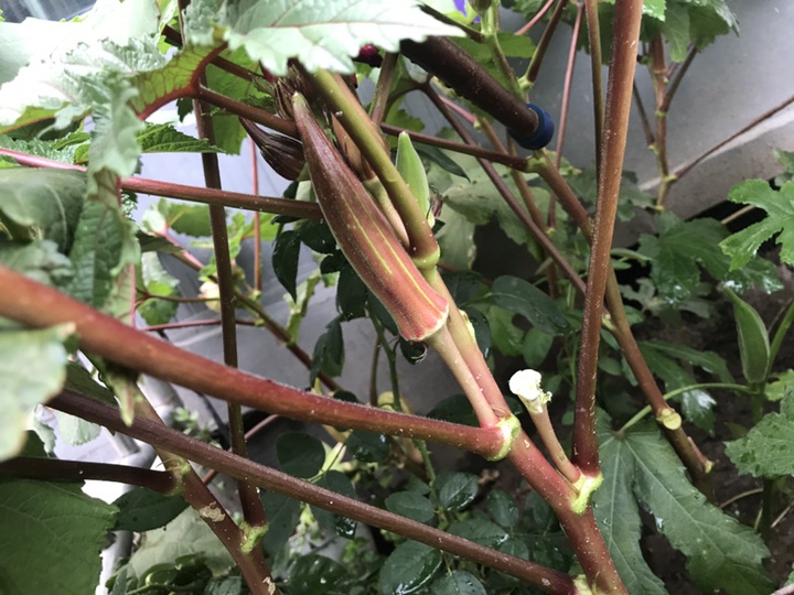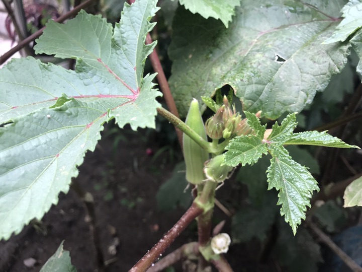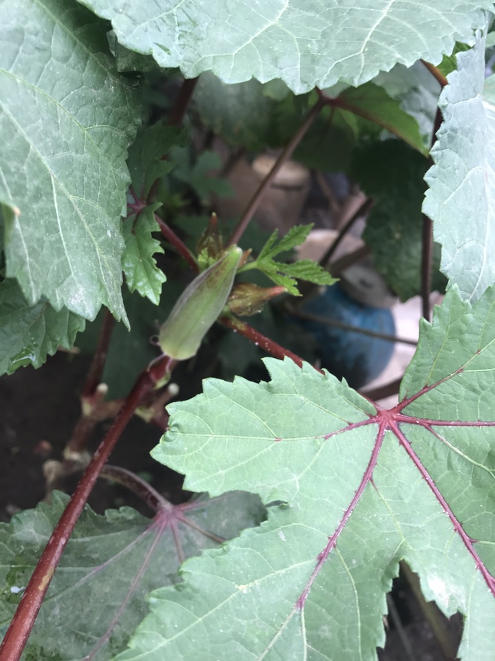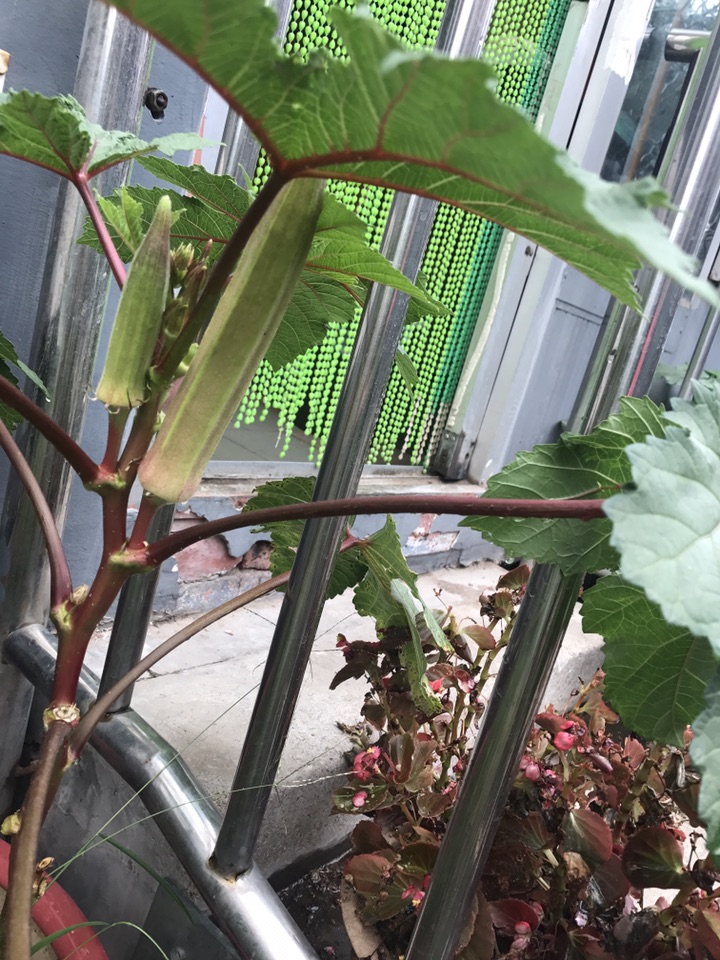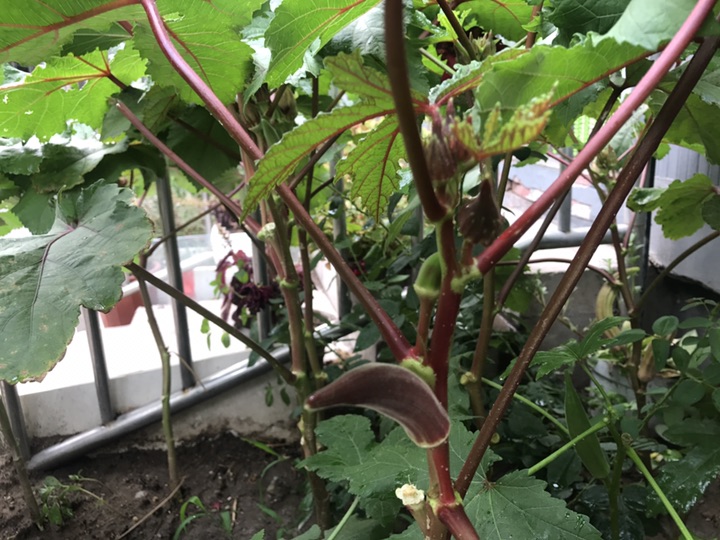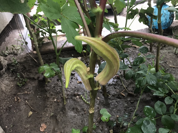 虽说是这么一大片的秋葵,可一开始还真没认出来它是秋葵。老爷爷出来后拿着拐杖一边把叶子挑开,一边跟我说,种了一场秋葵全让人给偷了。你看只有这里边的不显眼的几个还在,靠近马路牙子的都没了。
