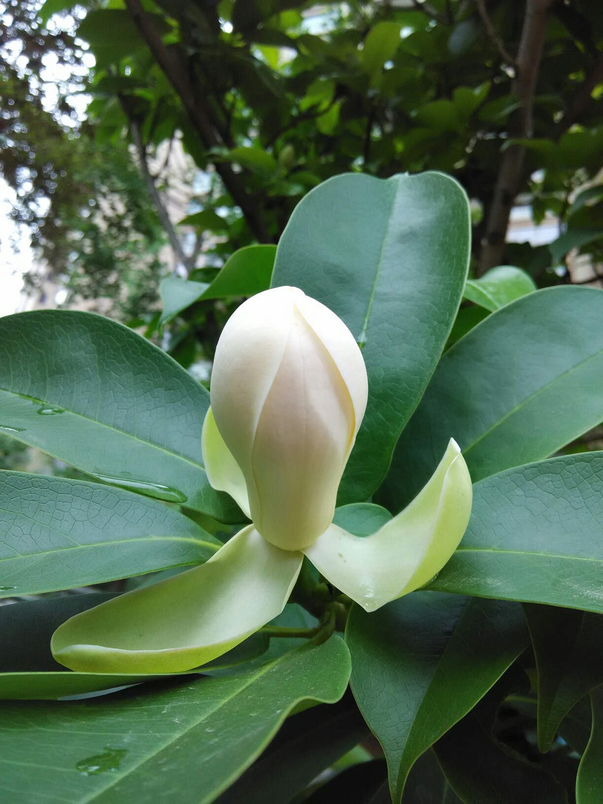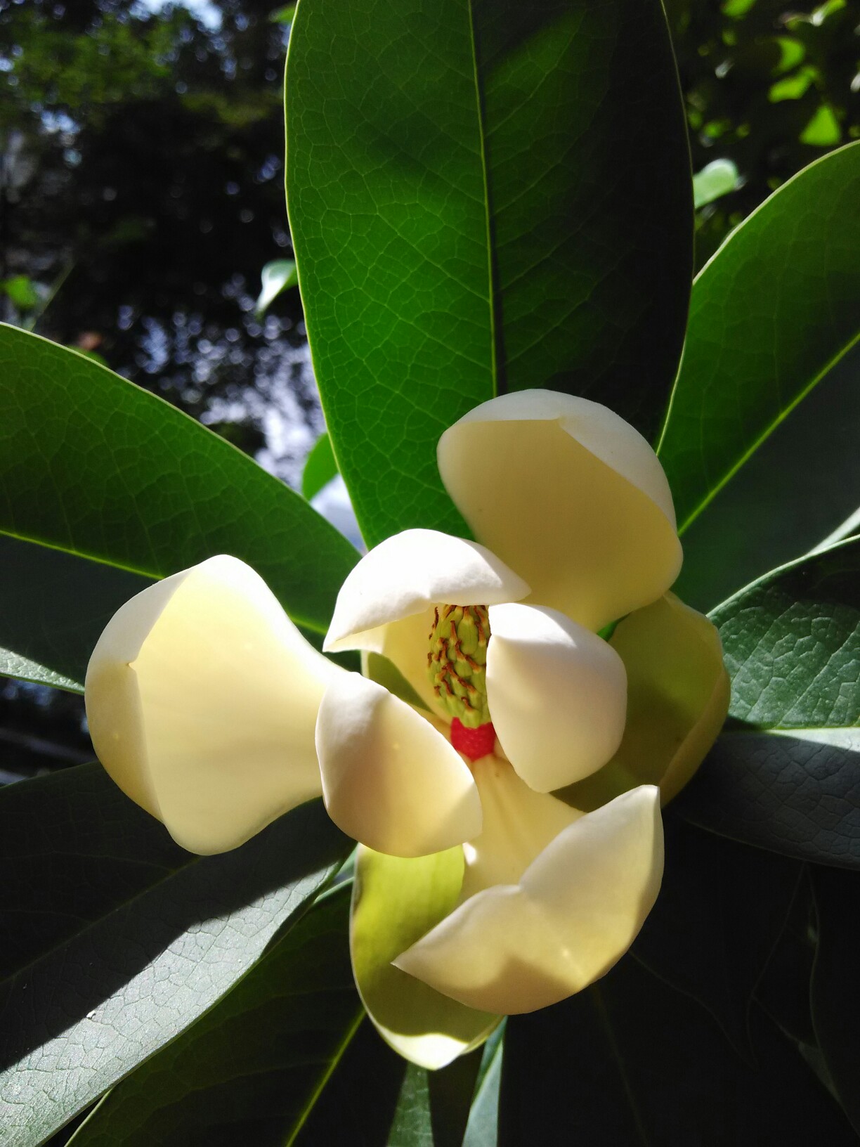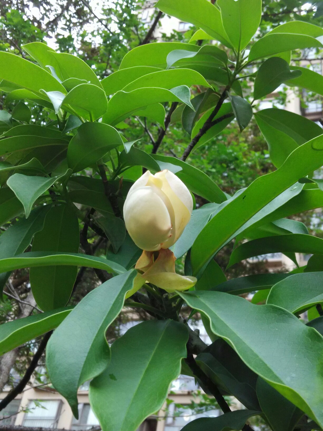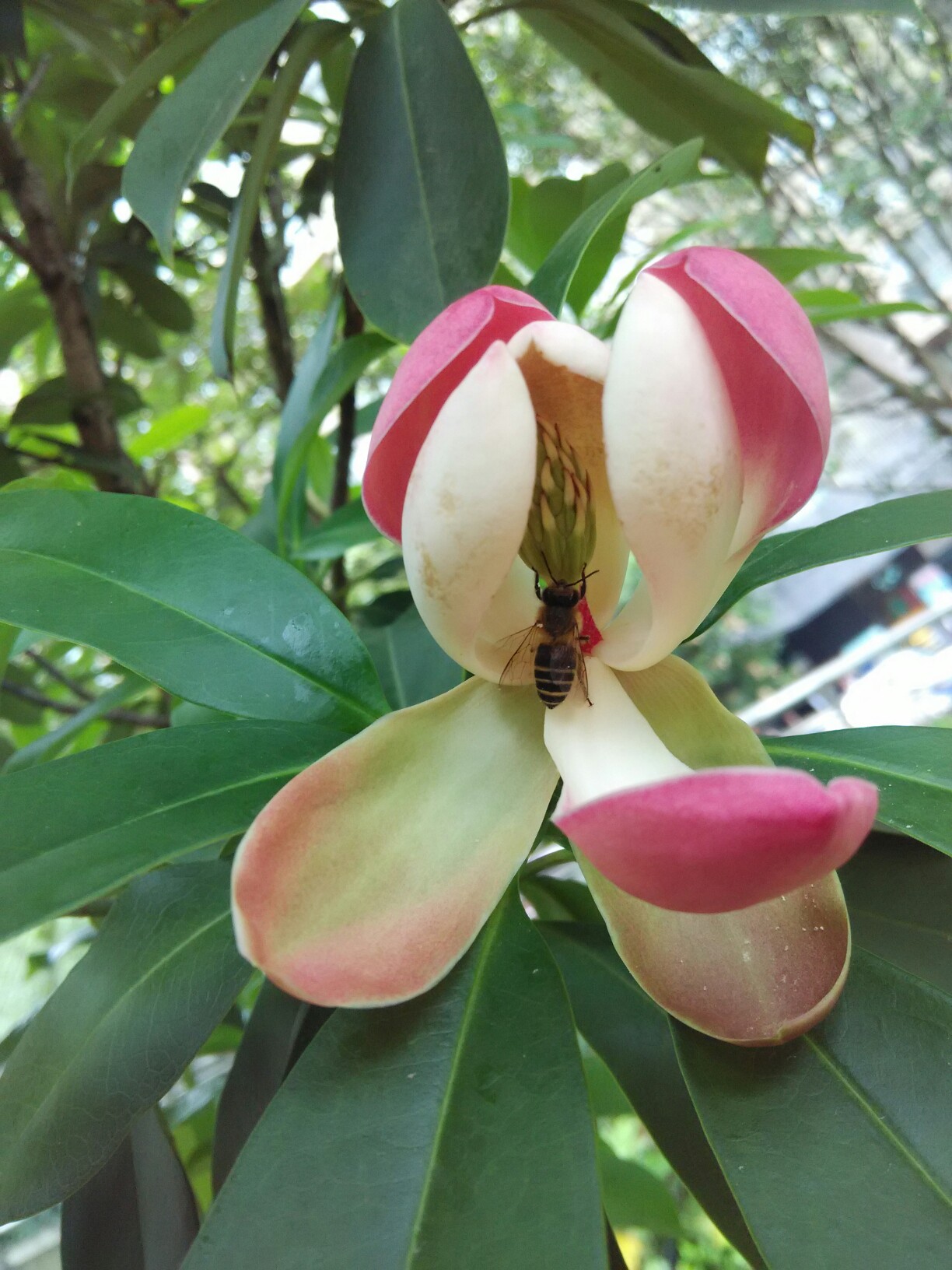 荷花玉兰,俏立枝头,蜂蝶飞舞。