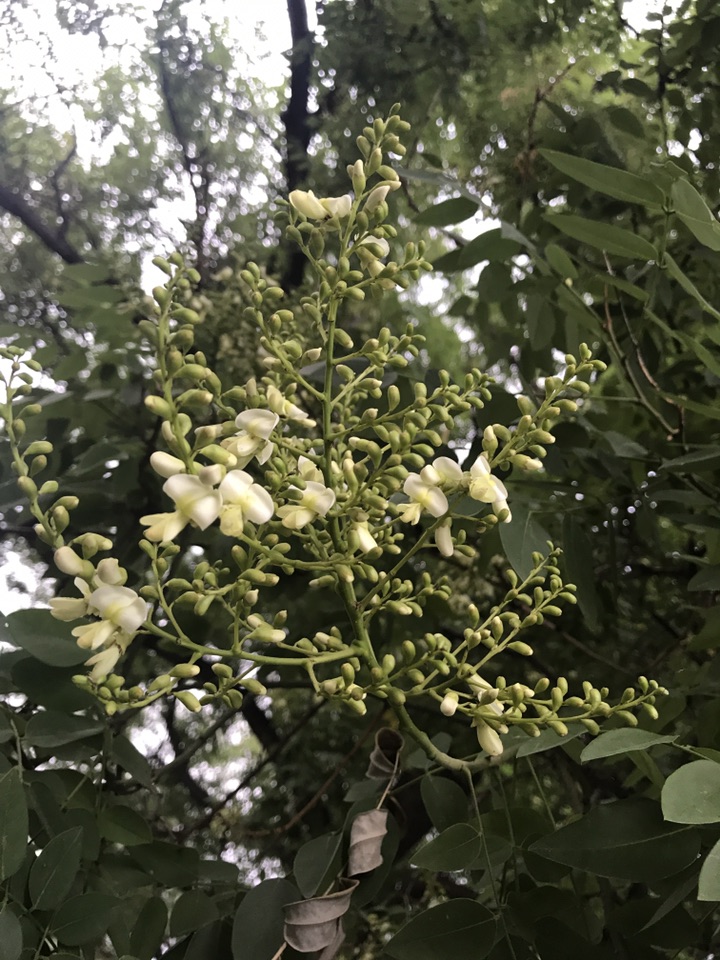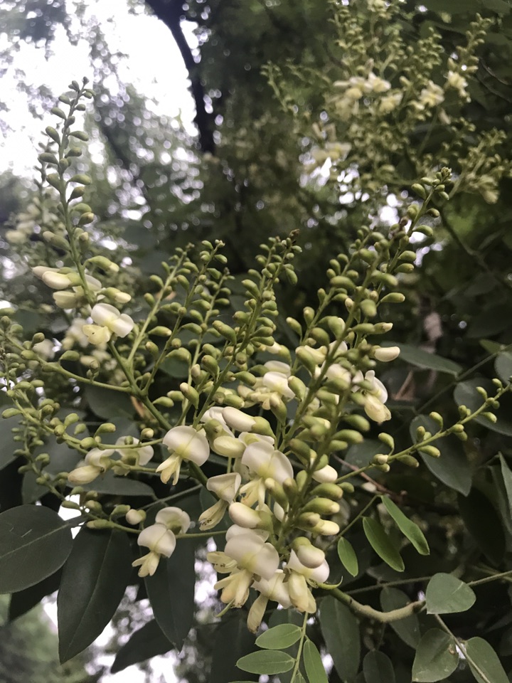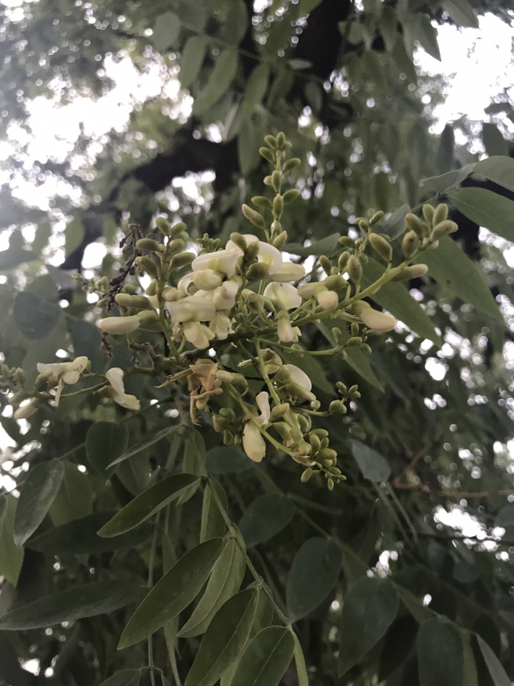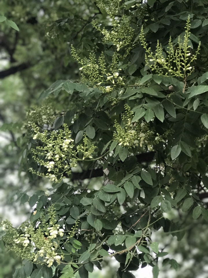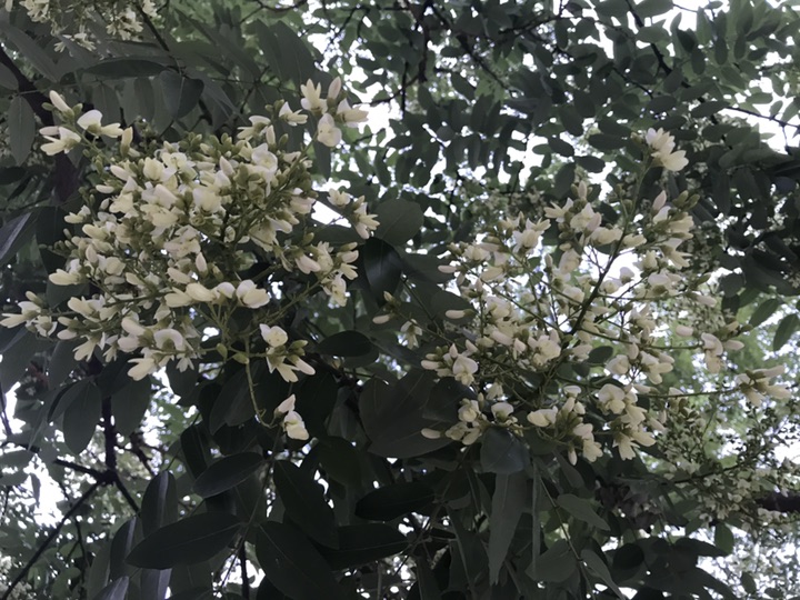 不知道为什么提到槐花,总觉得是五月的产物,“五月槐花”四个字总在脑海中挥之不去。查了资料国槐花期果在夏末,那“五月槐花”说的难不成是洋槐吗?槐树盛花时节,枝条嫩绿,蓬松如盖,白萼黄蕊的槐花星星点点地点缀其间,微风拂过,花儿纷纷飘落,兜兜转转、飘飘洒洒,宛如槐花雨给大地铺就一层薄薄的绿绒毯。