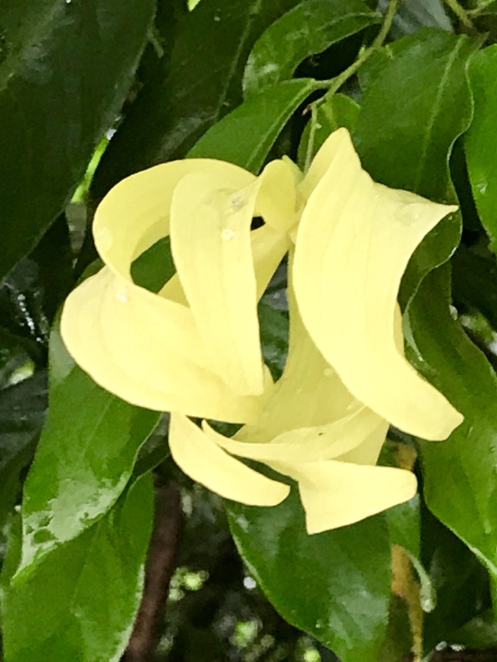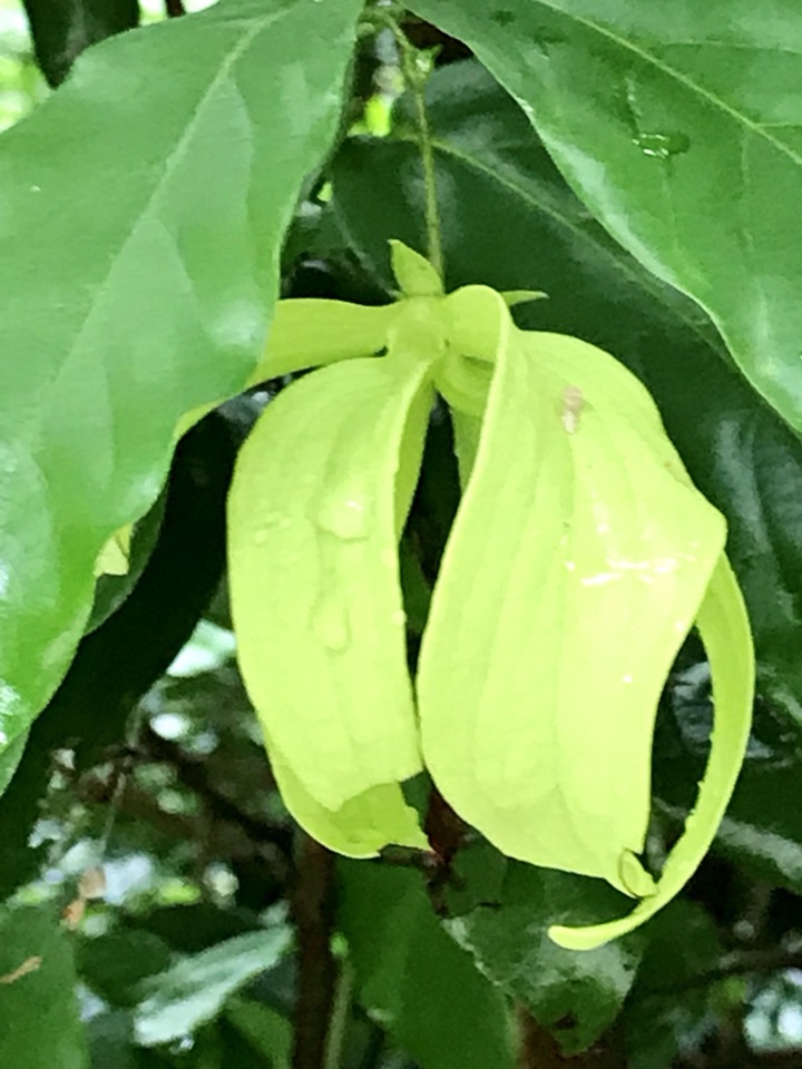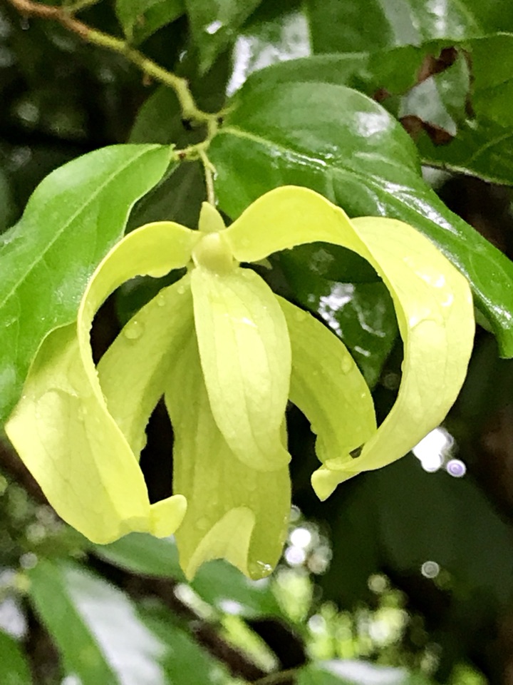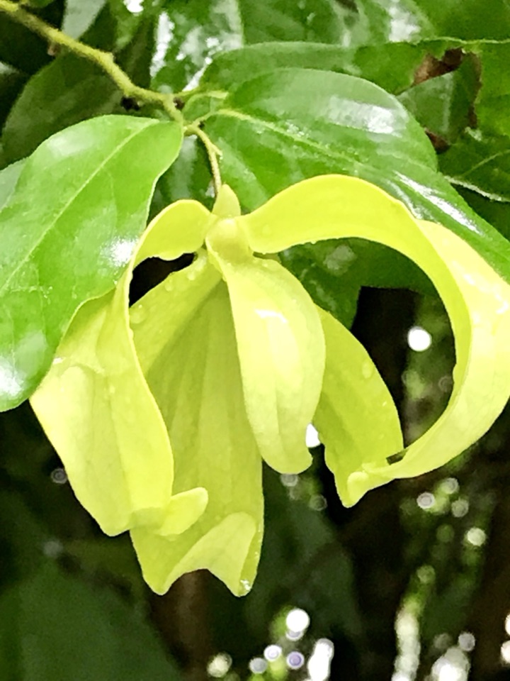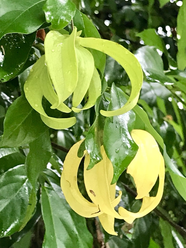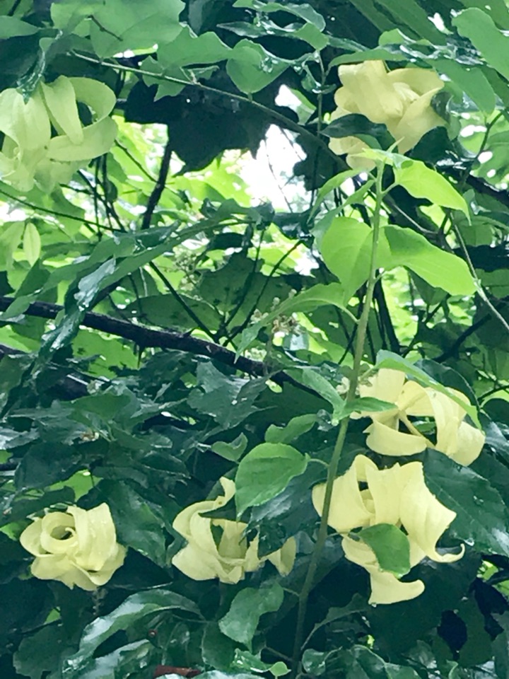 午後,雨停了,山坡上的植被郁郁蔥蔥,風吹花動,不曾見過,淺綠色、乳黃色的花朵吊在枝上,像絲帶樣卷,讓形色君辨認出來了,是假鷹爪,又一種變色花,初開時是綠色,慢慢地變成了黃白色。