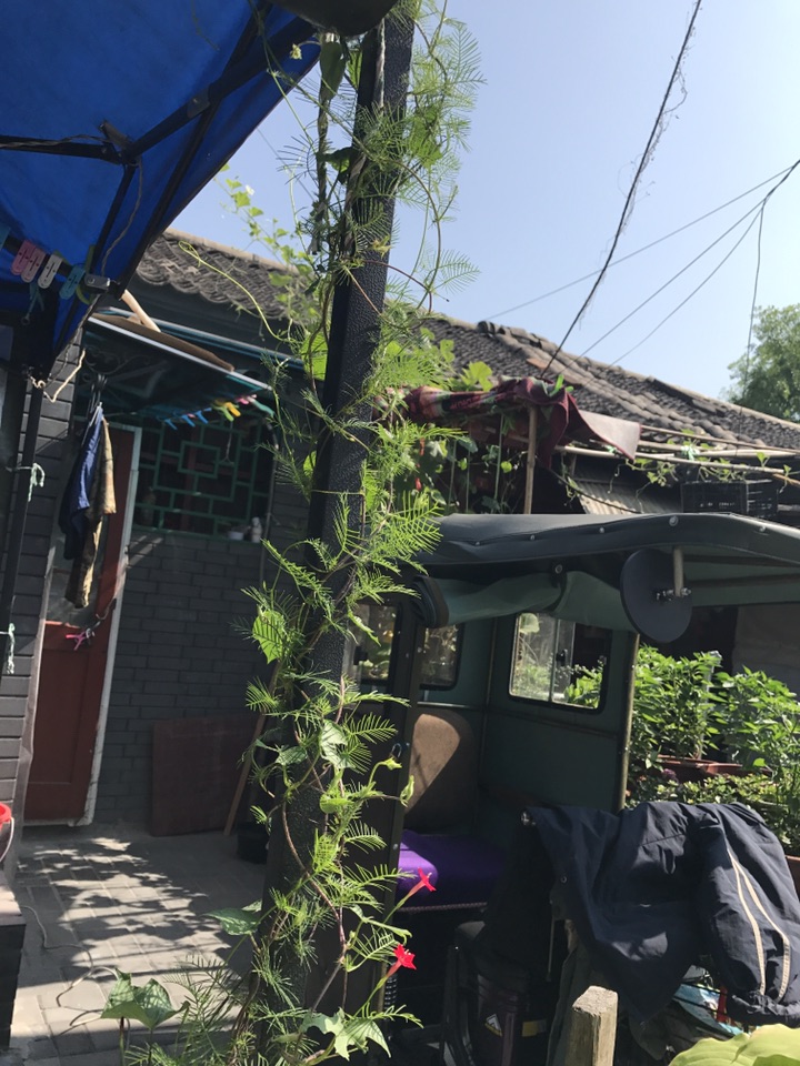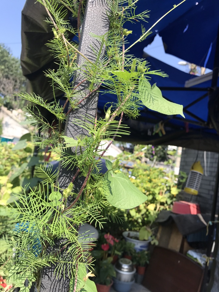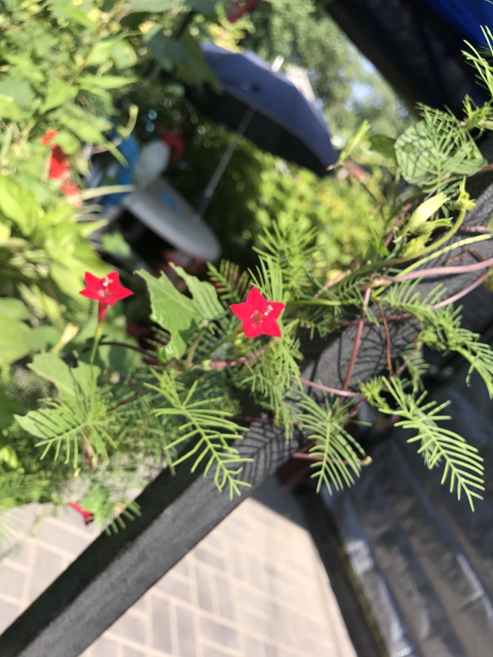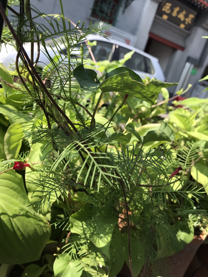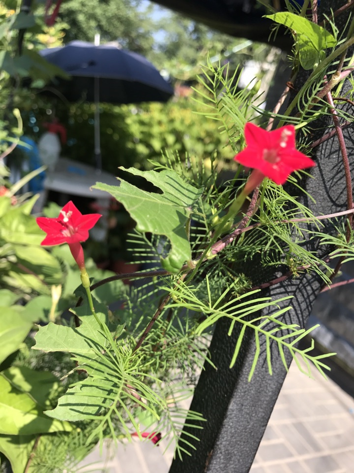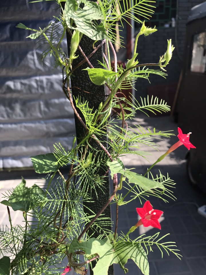 它的攀缘能力真的很强,一开始还只是探出点头,每天路过都很难注意到它。我也是因为拍牵牛花才不经意间发现它的,那时它是低矮的在玉簪的宽大叶子的掩映下更显的微不足道。也就一个星期左右吧,整个柱子都被它抱上了大腿,还开出了几枚鲜红的五角星花朵。这么鲜红的颜色这么旗帜化的存在让人不注意到它都很难了!
