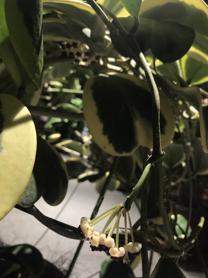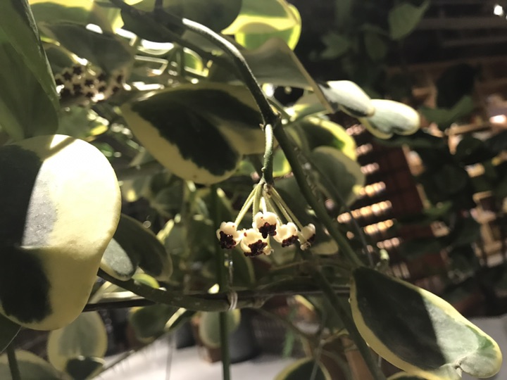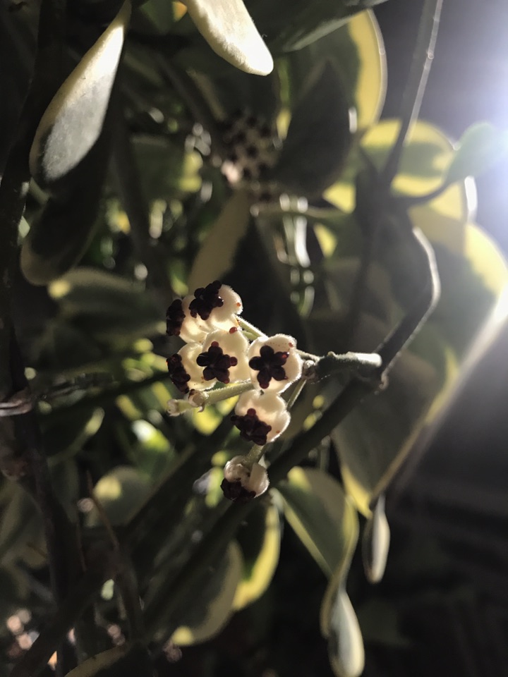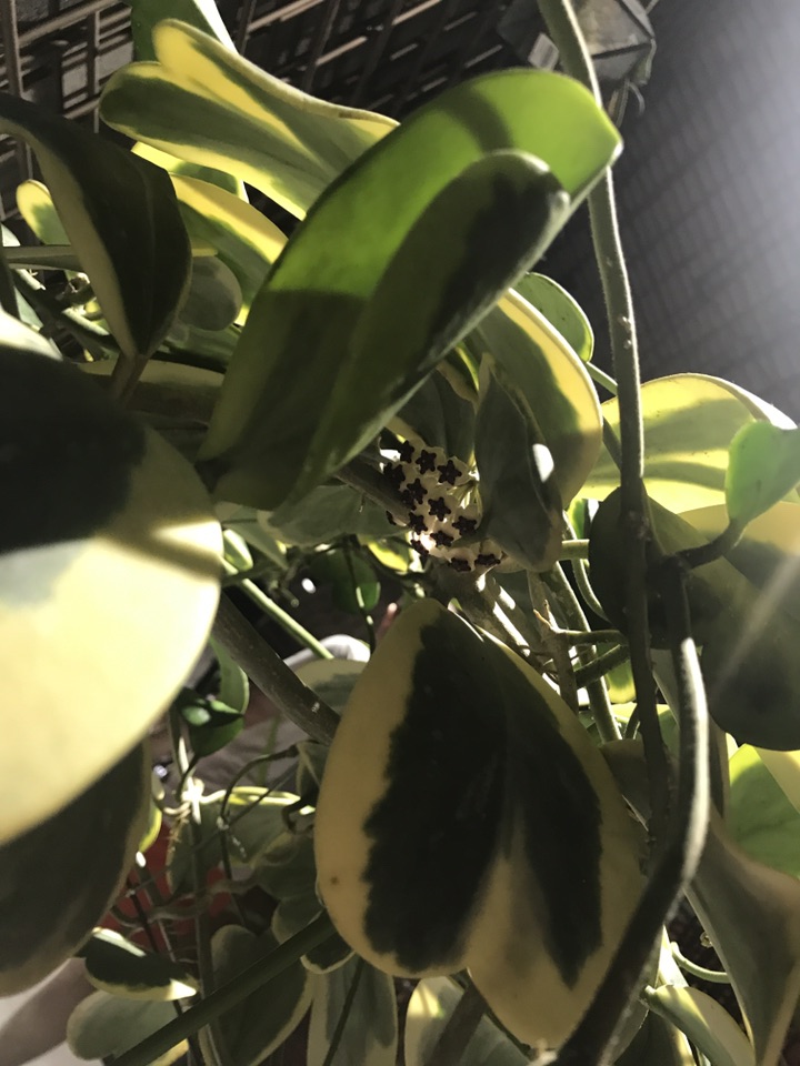 这一次很幸运的看到了她的花,总共开了两簇。不过它是低垂的,再加上有“心”的包围呵护,只可远观不可亵玩,很难给她拍一个好看的照片。幸好,肉眼看还是没问题的。球兰的花序很有特点,由十几至数数十朵星状小花,密密麻麻地聚集成聚伞花序,看上去像一个硕大的球形捧花,我想球兰的“球”字也是这么来的吧。