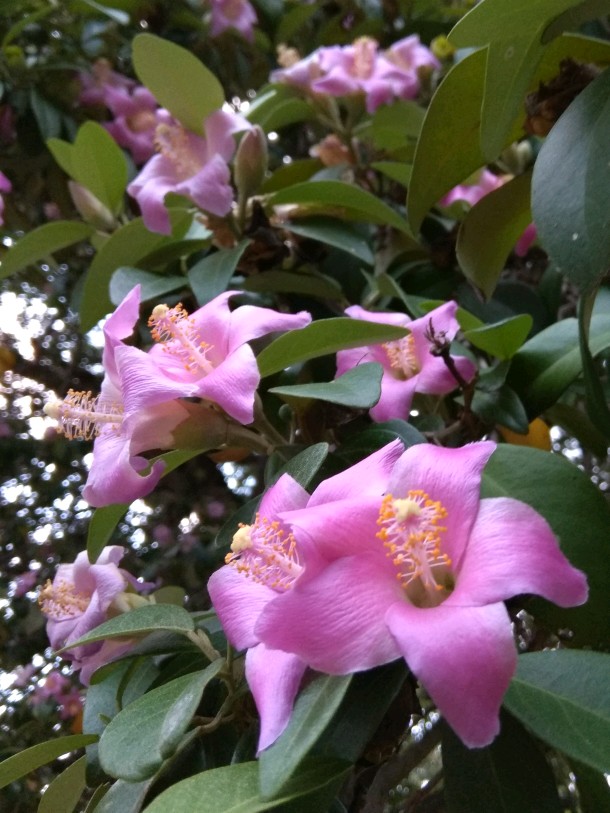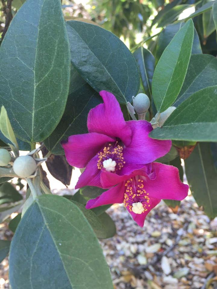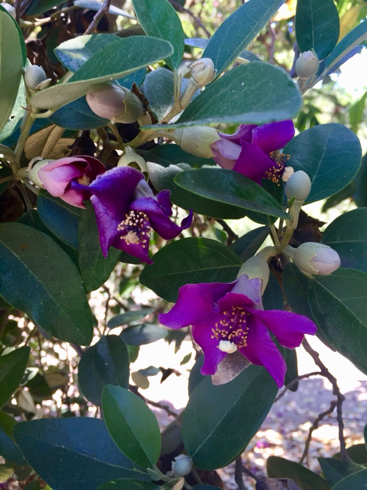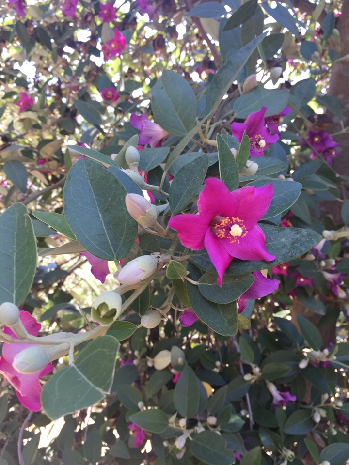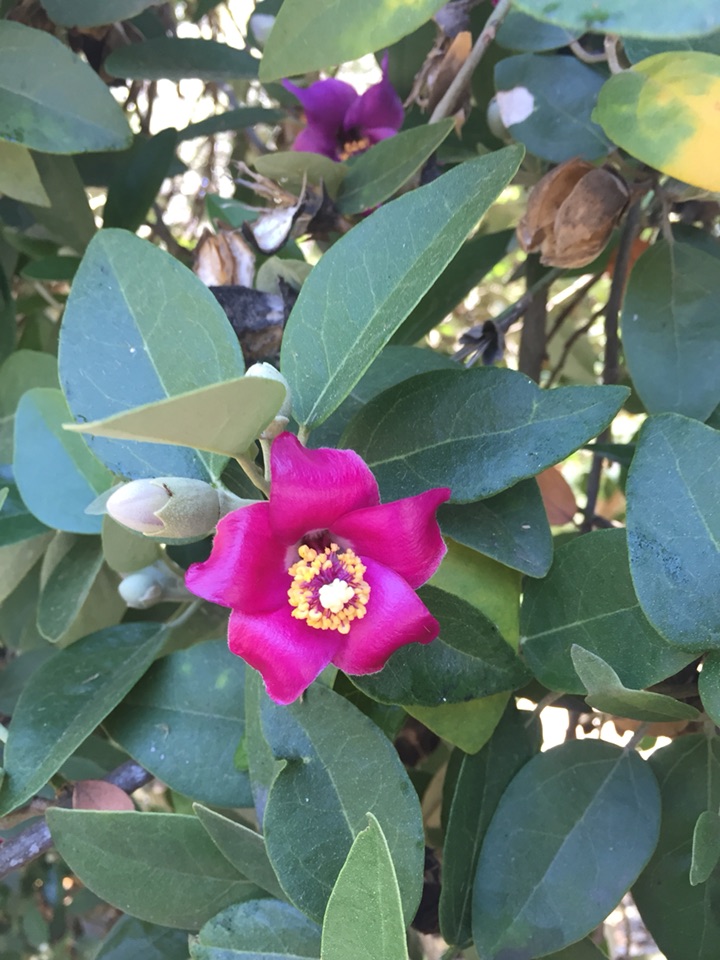 San Diego植物园里的澳大利亚园里看到的 英文名叫“Cow itch tree” 中到大型树 紫红色的花、黄色花蕊 深绿色革质叶子 除了树形和花的颜色外 其花、叶子都跟一种山茶花有些相似