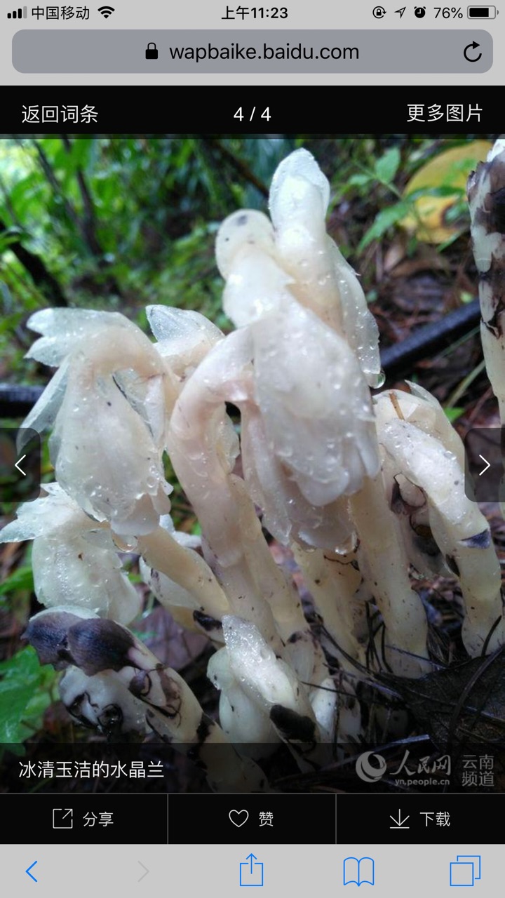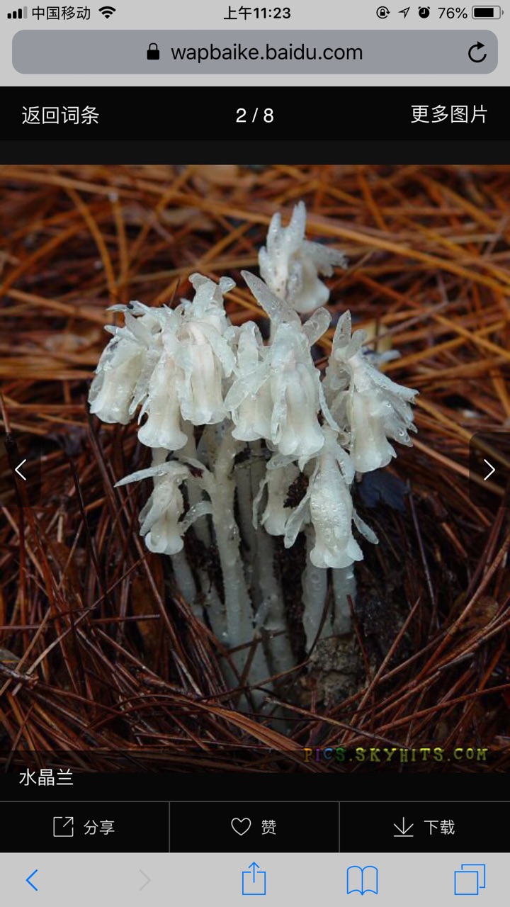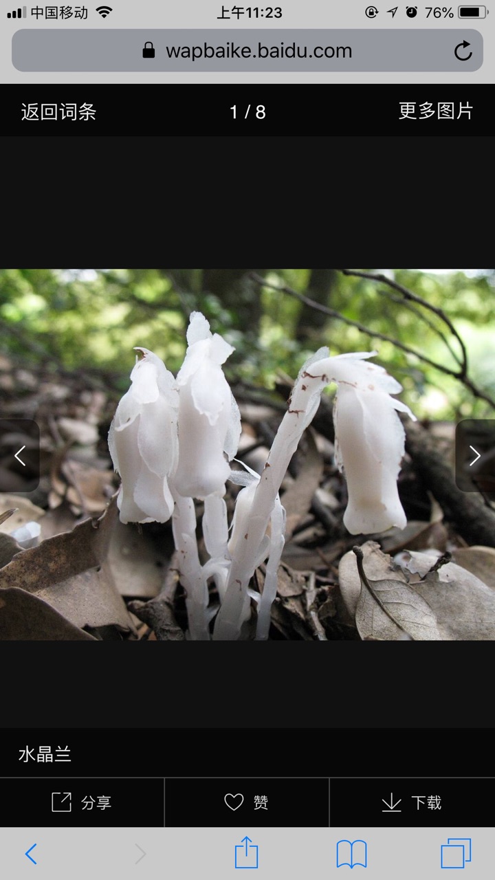 水晶兰(学名:Monotropa uniflora Linn.)是鹿蹄草科,水晶兰属多年生草本腐生植物。茎直立,不分枝,高可达30厘米,全株无叶绿素,白色,肉质,叶片互生,长圆形或狭长圆形或宽披针形,先端钝头,无毛或上部叶稍有毛,边缘近全缘。花顶生,先下垂,后直立,花冠筒状钟形,苞片鳞片状,与叶同形;萼片鳞片状,楔形或倒卵状长圆形,花丝有粗毛,花药黄色;蒴果椭圆状球形,8-9月开花;9-11月结果。分布于中国山西、陕西、甘肃、青海、浙江、安徽、台湾、湖北、江西、云南、四川、贵州、西藏等省、区。苏联、日本、印度、东南亚、北美也有分布。生于海拔800-3850米山地林下。