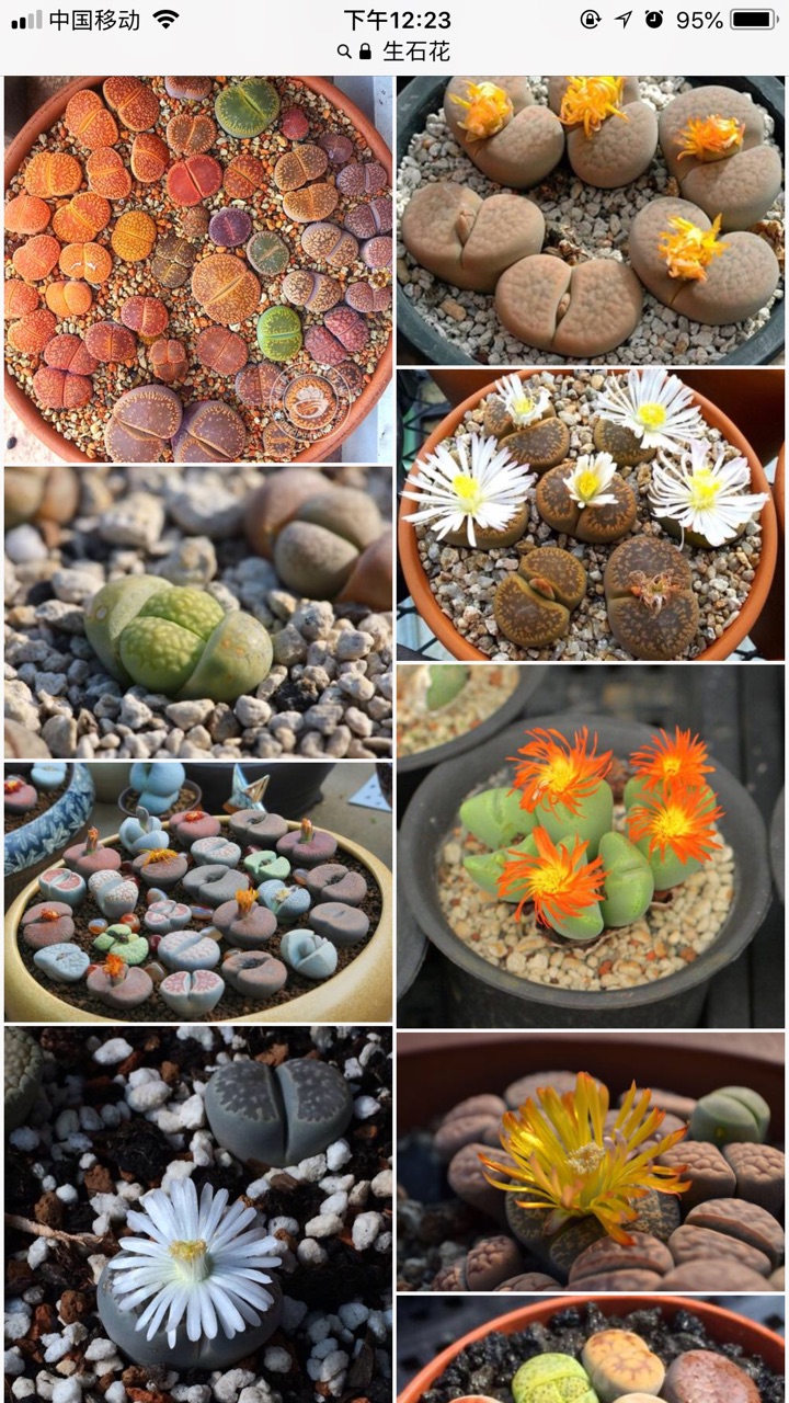 生石花(学名:Lithops N. E. Br.)是石竹目,番杏科生石花属全属植物的总称,约有40种。多年生肉质草本,几乎无茎;球状叶色彩多变,叶表皮较硬,色彩多变,顶部具有深色树枝状凹陷纹路,或花纹斑点,称作“视窗”。植物顶部有一裂缝,裂缝中开花,花单生,雏菊状,花茎2-3厘米,花白或黄色,花期盛夏至中秋。原产南部非洲,喜温暖干燥和阳光充足环境,怕低温,忌强光暴晒,该属植物生长适温为10-30℃,冬季温度不低于12℃,可短暂耐受4-5℃的低温。宜生长在疏松透气的中性沙壤土。繁殖方法有播种和分株。