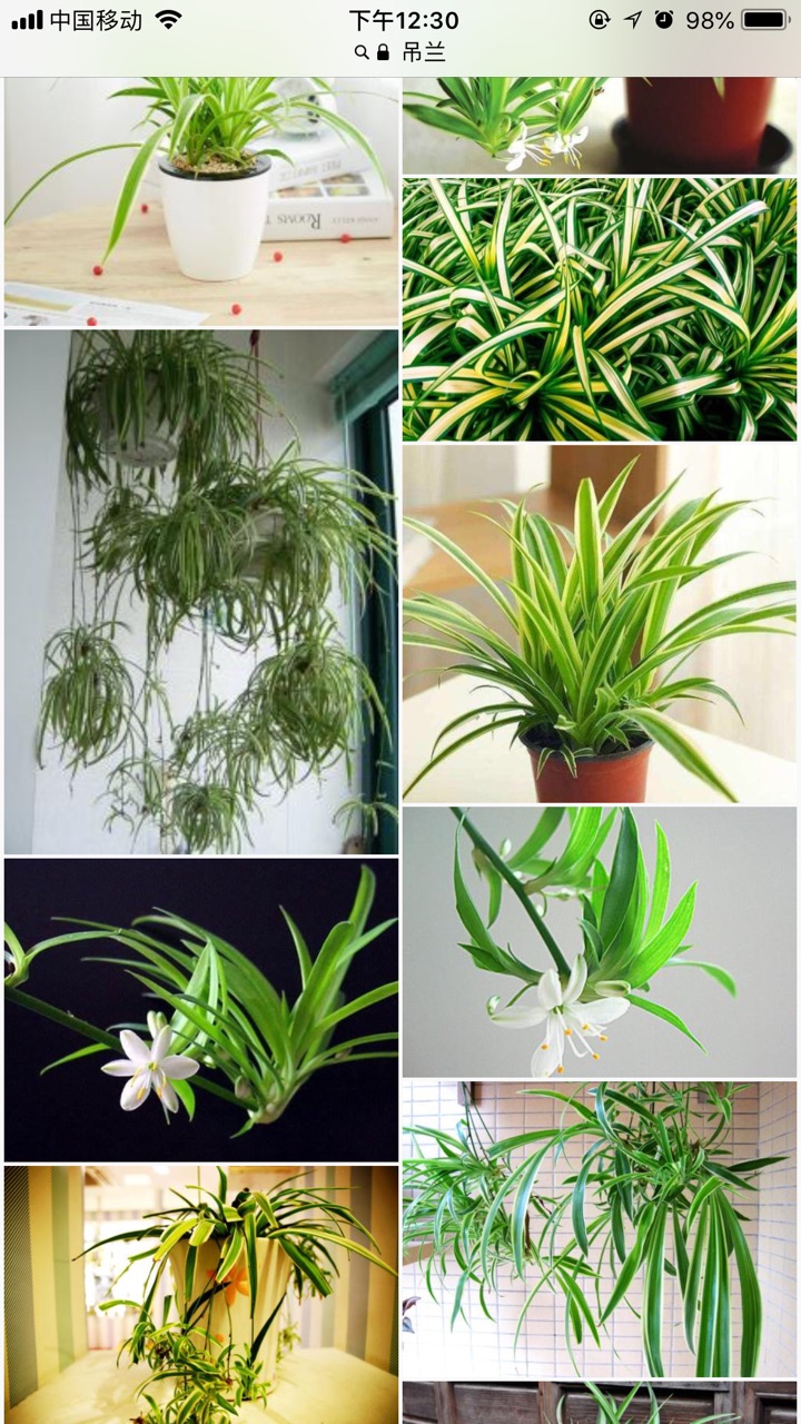 吊兰(学名:Chlorophytum comosum(Thunb.)Baker.),吊兰又称:垂盆草、挂兰、钓兰、兰草、折鹤兰、空气卫士,[1]西欧又叫蜘蛛草或飞机草,原产于南非。单子叶植物纲、天门冬科、吊兰属多年生常绿草本植物,根状茎平生或斜生,有多数肥厚的根。叶丛生,线形,叶细长,似兰花。有时中间有绿色或黄色条纹。花茎从叶丛中抽出,长成匍匐茎在顶端抽叶成簇,花白色,常2-4朵簇生,排成疏散的总状花序或圆锥花序偶然内部会出现紫色花瓣;蒴果三棱状扁球形,长约5毫米,宽约8毫米,每室具种子3-5颗。花期5月,果期8月。[2]植株有净化空气的作用,全株可入药