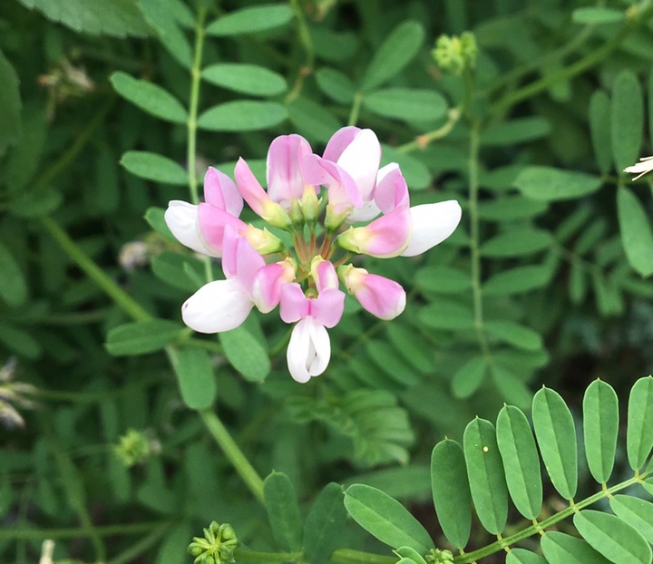 那天,从宿根园出来走上北京植物园主道的时候,在路旁水坑边看到一簇簇粉色的花,花冠不大,花瓣上粉下白,花型颇像槐花,仔细再看,叶子跟槐花竟也十分相似,但我可以打保票,那绝对不是槐花,但我也承认,那花比槐花漂亮。