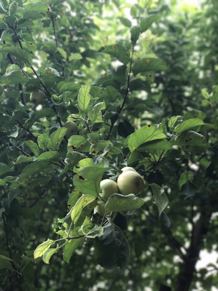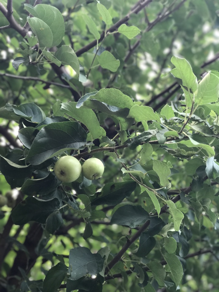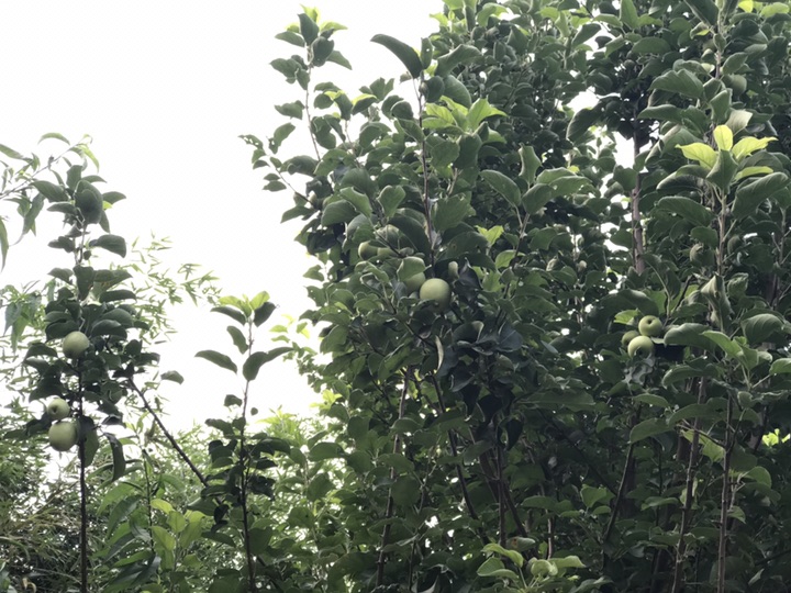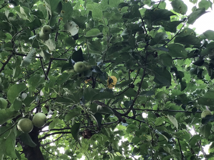 白天天气是多云的,有一点点闷。比起房间的闷,外面的世界还是要更舒服很多。晚饭后去小院走了走,发觉小院的苹果在不觉间慢慢的长大了,零星的果子虽说有点孤零零的感觉,但也快到成熟的季节了。你看,第一张图里的那个不是有点泛红了吗?这么稀疏的一点点,今年的果子怕是吃不上啰。