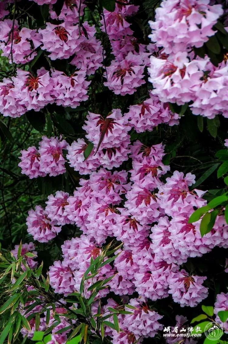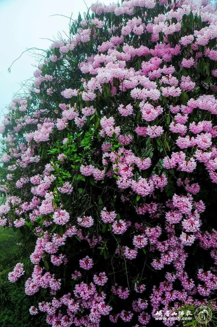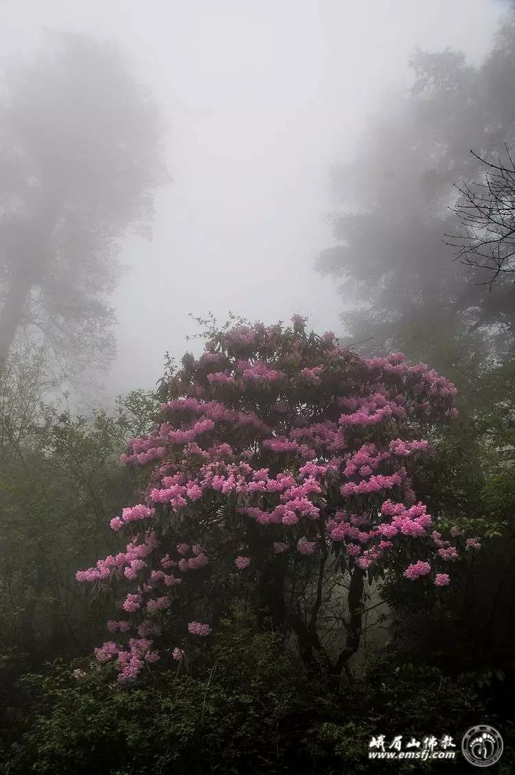 初夏五月,是峨眉山高山杜鹃怒放的季节,过零公里后,那一坡坡,一片片,路旁谷边,高低远近,由杜鹃花汇成的巨流,从山顶一泻而下,纵目眺望,花海荡漾,香气浮动。