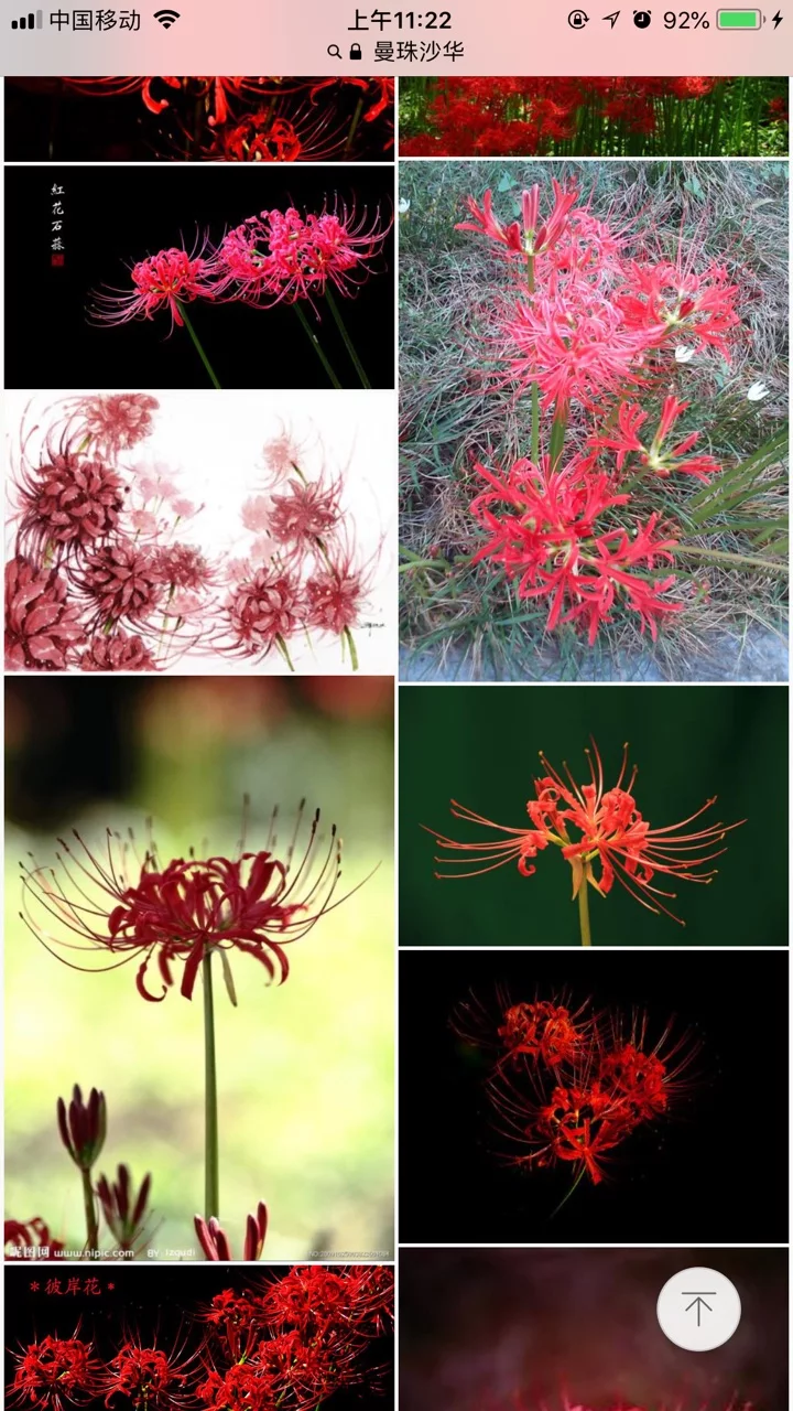 曼珠沙华,别名红色彼岸花(Lycorisradiata)、又称“舍子花”。是多年生草本植物,地下有球形鳞茎,外包暗褐色膜质鳞被。叶带状较窄,色深绿,自基部抽生,发于秋天花谢后。曼珠沙华的花期为夏末秋初,约从7月至9月。花茎长30-60厘米,通常4-6朵排成伞形,着生在花茎顶端,花瓣倒披针形,花被红色(亦有白花品种),向后开展卷曲,边缘呈皱波状,花被管极短;雄蕊和花柱突出,花型较小,周长在6厘米以上。花开不见叶, 叶在不见花, 花叶两不见。这种花经常长在野外的石缝里、坟头上,所以有人说它是“黄泉路上的花”。