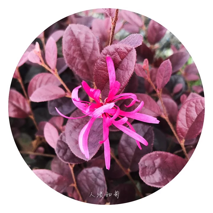 常绿灌木或小乔木。树皮暗灰或浅灰褐色,多分枝。嫩枝红褐色,密被星状毛。叶革质互生,卵圆形或椭圆形,长2~5cm,先端短尖,基部圆而偏斜,不对称,两面均有星状毛,全缘,暗红色。花瓣4枚,紫红色线形长1~2cm,花3~8朵簇生于小枝端。蒴果褐色,近卵形。花期4~5月,花期长,约30~40天,国庆节能再次开花。花3~8朵簇生在总梗上呈顶生头状花序,紫红色。果期8月。主要分布于长江中下游及以南地区、印度北部。花、根、叶可药用。