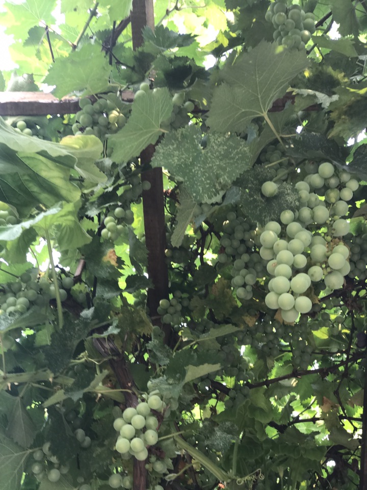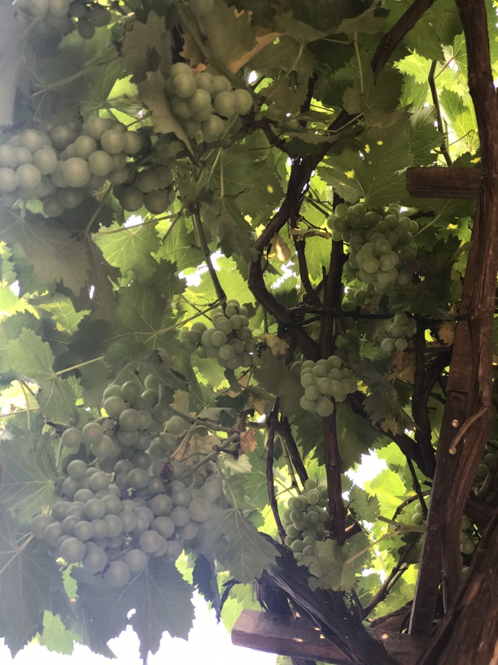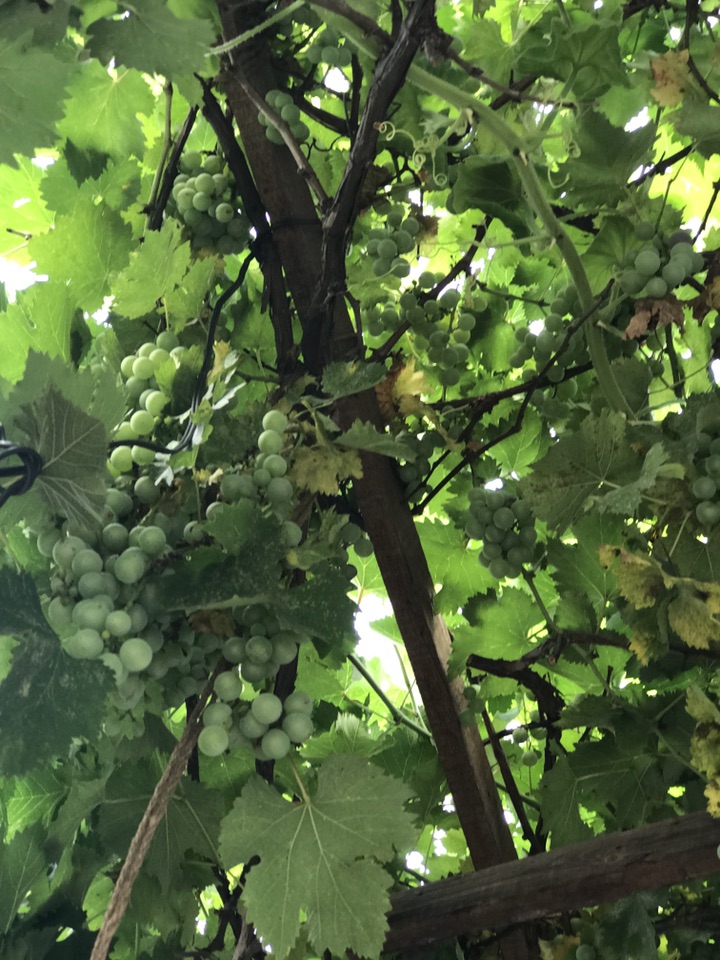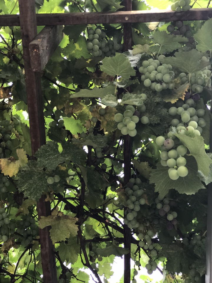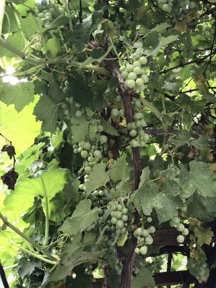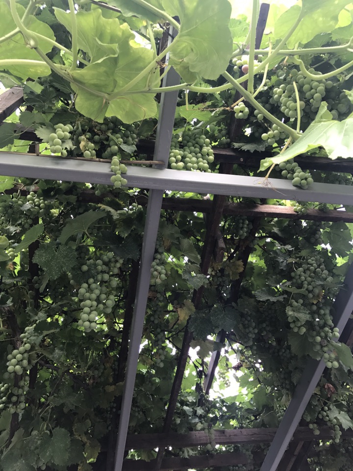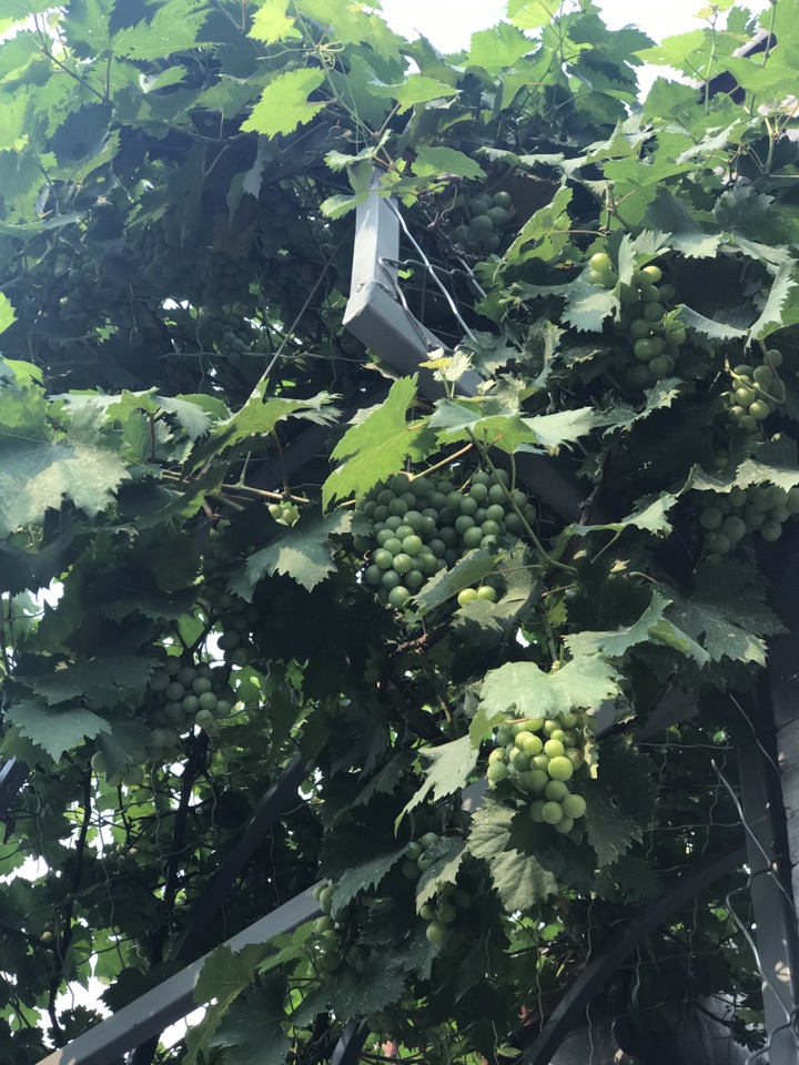 胡同里遇见的葡萄但凡挂果的,都细致的用袋子套着,独有这一架的葡萄得以见天日。还未成熟的葡萄一串一串像绿色的珍珠,挂满了葡萄架。心中暗想,带到葡萄成熟时,各种颜色夹杂其中想必会是一副极美的图画吧……