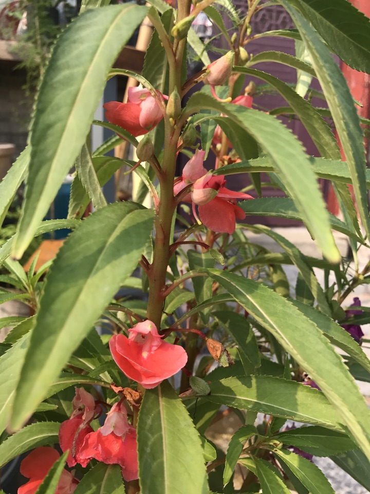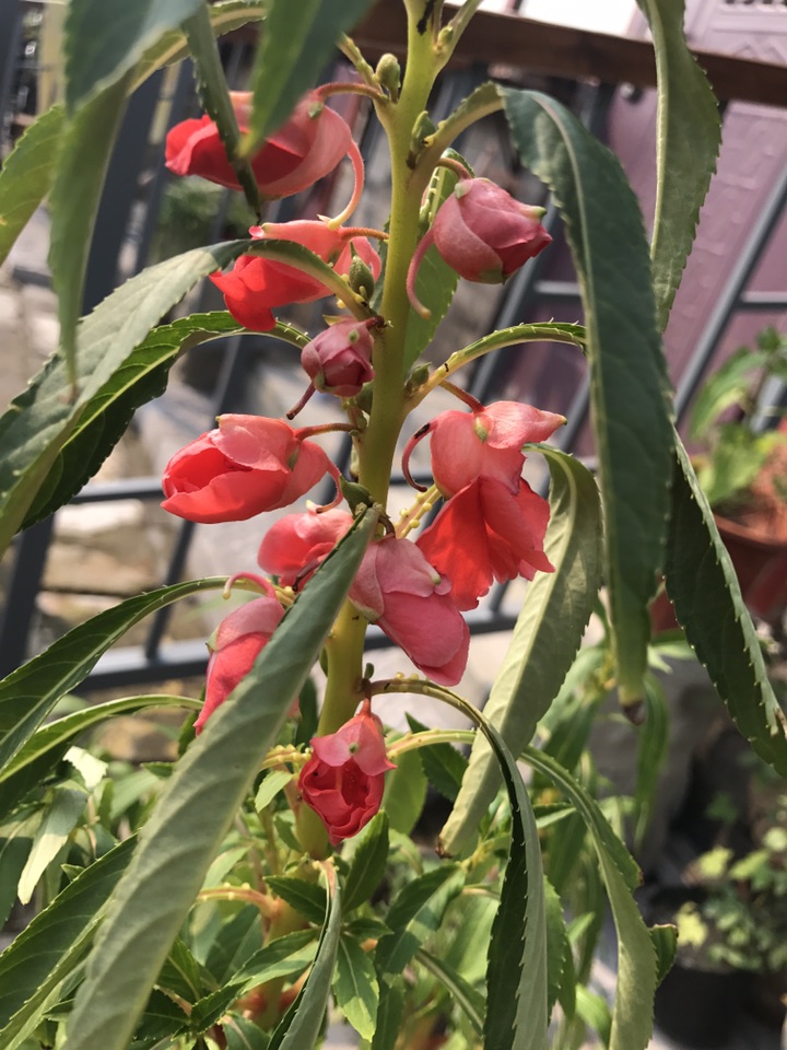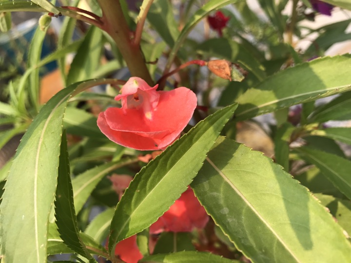 凤仙花的花腋生,呈180°倒置,萼片3枚,其中2枚侧生萼片小,披针形,一枚倒置的萼片呈舟形,基部延长形成一个长长的距。从上至下依次为:花梗和2侧生萼片、旗瓣、雄蕊和雌蕊、4枚成对合生的花瓣、舟状的唇瓣。神奇的花瓣和花萼的组合造就了凤仙花奇特的花型,再加上色彩的缤纷,视线很难不被它吸引了去。