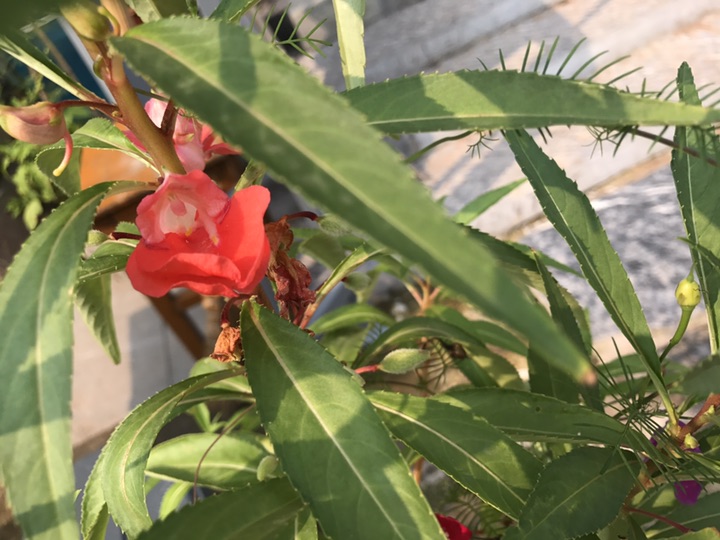 凤仙花为一年生草本,茎粗壮,肉质,茎下部的节常常膨大。单叶互生,叶片披针形,叶片边缘的有细锯齿,叶柄处有成对的腺体。整个植株看起来并不起眼,但当它开花之时,可是甚为醒目呢。
