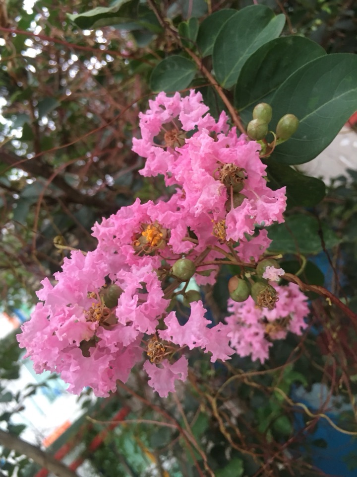 紫薇树是中国珍贵的环境保护植物。人们称之为百日红、痒痒树,因为只要轻轻一动它的树皮,它就会颤抖不止。这是因为这种的树干对振动十分敏感。它是千屈菜科落叶乔木,高可达10米。圆锥花序着生于当年生枝条的顶端,花序甚大,长30~50厘米,上面有花数十朵或更多;花直径约 3厘米,白色、堇色、红色和紫色;每年夏秋季开花,每花序可开放50天左右,全株花期长达4个月之久。是优良的园林观赏花木,亦是良好的树桩盆景种类之一。紫薇(学名:Lagerstroemia indica)是一种小乔木,原产中国,是一种适应性强的长寿树种。因其树型不高,所以非常适宜作为庭院观赏树和街道绿化树。紫薇在中国已经有几千年的栽培史,唐朝时就盛植于长安宫廷之中。近几个世纪被引种到世界各地,西方人从印度发现这种树,因此法语称其为“印度丁香”(lilas des Indes)。[1]