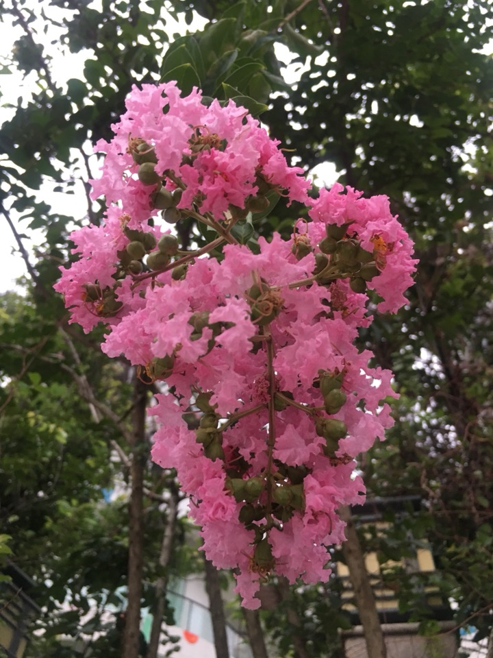 紫薇树是中国珍贵的环境保护植物。人们称之为百日红、痒痒树,因为只要轻轻一动它的树皮,它就会颤抖不止。这是因为这种的树干对振动十分敏感。它是千屈菜科落叶乔木,高可达10米。圆锥花序着生于当年生枝条的顶端,花序甚大,长30~50厘米,上面有花数十朵或更多;花直径约 3厘米,白色、堇色、红色和紫色;每年夏秋季开花,每花序可开放50天左右,全株花期长达4个月之久。是优良的园林观赏花木,亦是良好的树桩盆景种类之一。紫薇(学名:Lagerstroemia indica)是一种小乔木,原产中国,是一种适应性强的长寿树种。因其树型不高,所以非常适宜作为庭院观赏树和街道绿化树。紫薇在中国已经有几千年的栽培史,唐朝时就盛植于长安宫廷之中。近几个世纪被引种到世界各地,西方人从印度发现这种树,因此法语称其为“印度丁香”(lilas des Indes)。[1]