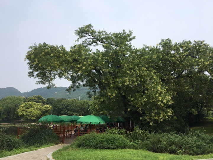 植物园的大槐树,临湖而居,下可乘凉,上可眺望远山,可俯视睡莲,可欣闻槐香,是游玩中途歇脚的好去处。