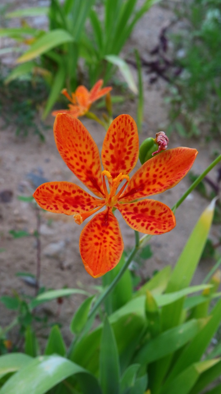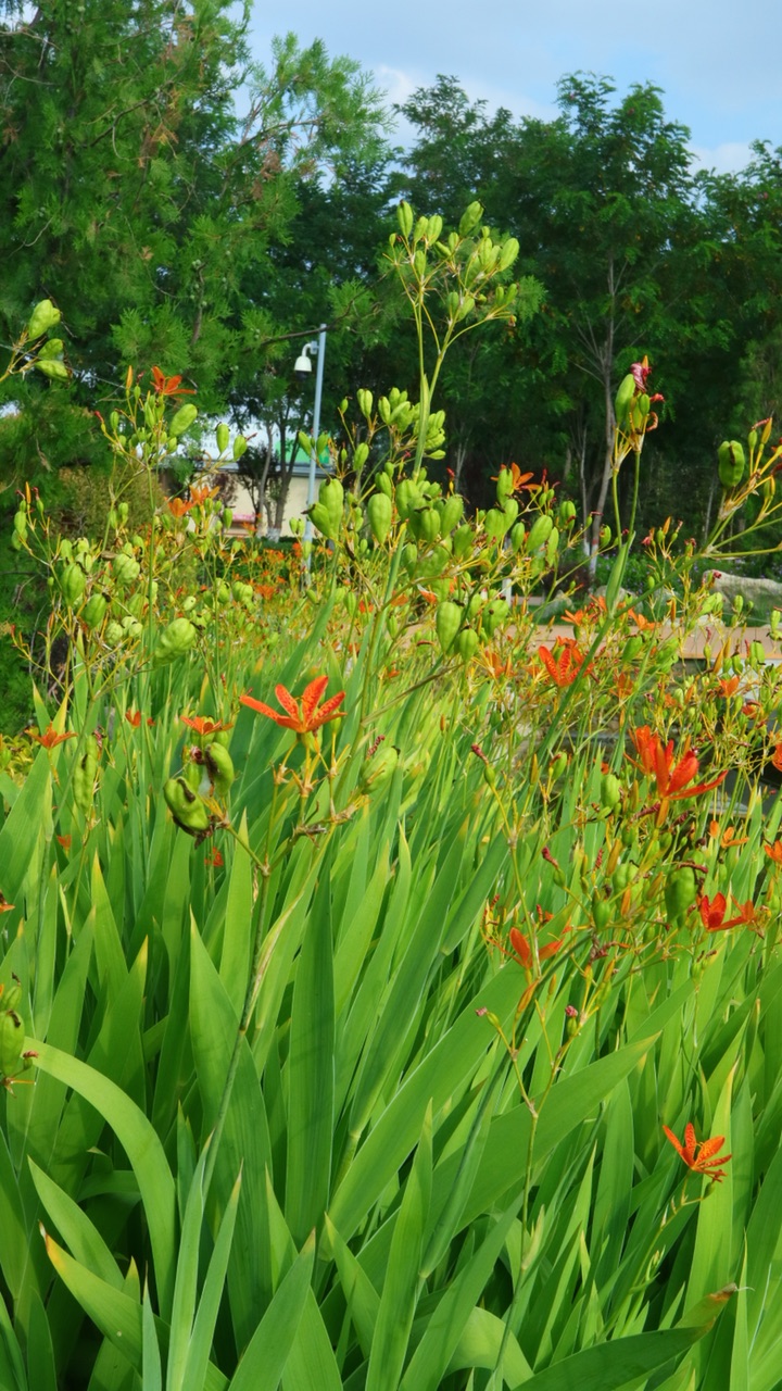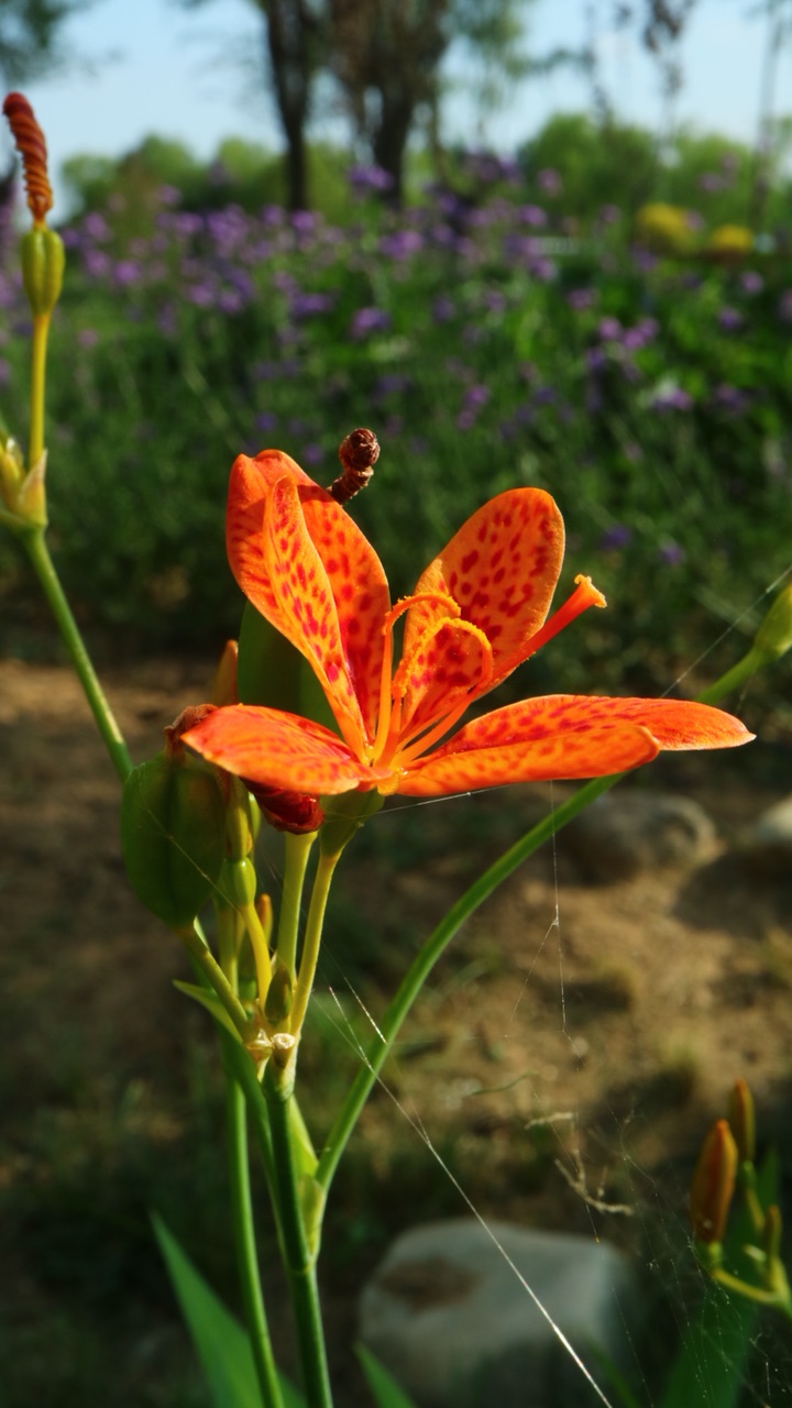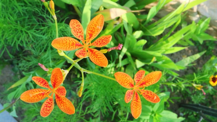 炎炎夏季,艳阳高照,射干花开的一片橙红瓦绿。