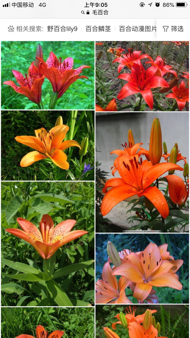 毛百合(学名:Lilium dauricum Ker Gawl.):鳞茎卵状球形,高约1.5厘米,直径约2厘米;鳞片宽披针形,长1-1.4厘米,宽5-6毫米,白色,有节或有的无节。茎高50-70厘米,有棱。叶散生,在茎顶端有4-5枚叶片轮生。花1-2朵顶生,橙红色或红色,有紫红色斑点;外轮花被片倒披针形,内轮花被片稍窄,蜜腺两边有深紫色的乳头状突起。蒴果矩圆形,长约4-5.5厘米,宽3厘米。花期6-7月,果期8-9月。[1]生山坡灌丛间、疏林下、路边及湿润的草甸,海拔450-1500米。分布于中国、朝鲜、日本、蒙古和俄罗斯。鳞茎含淀粉,可供食用、酿酒或作药用。