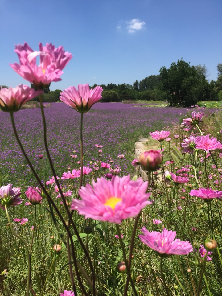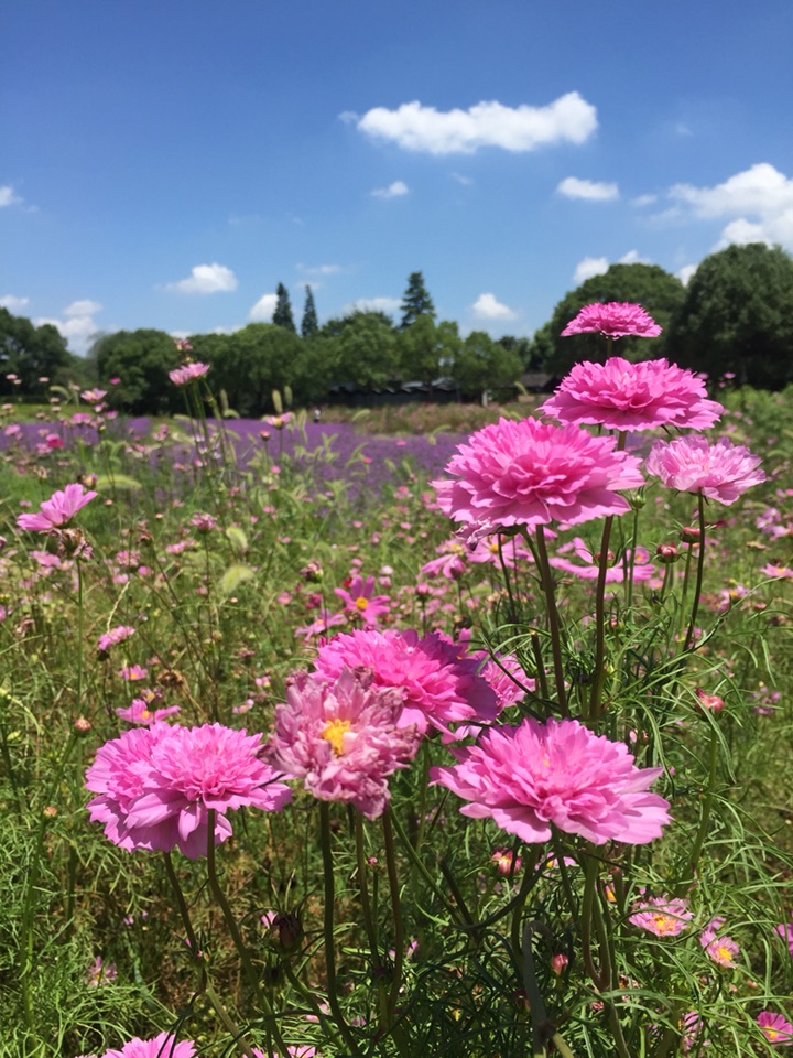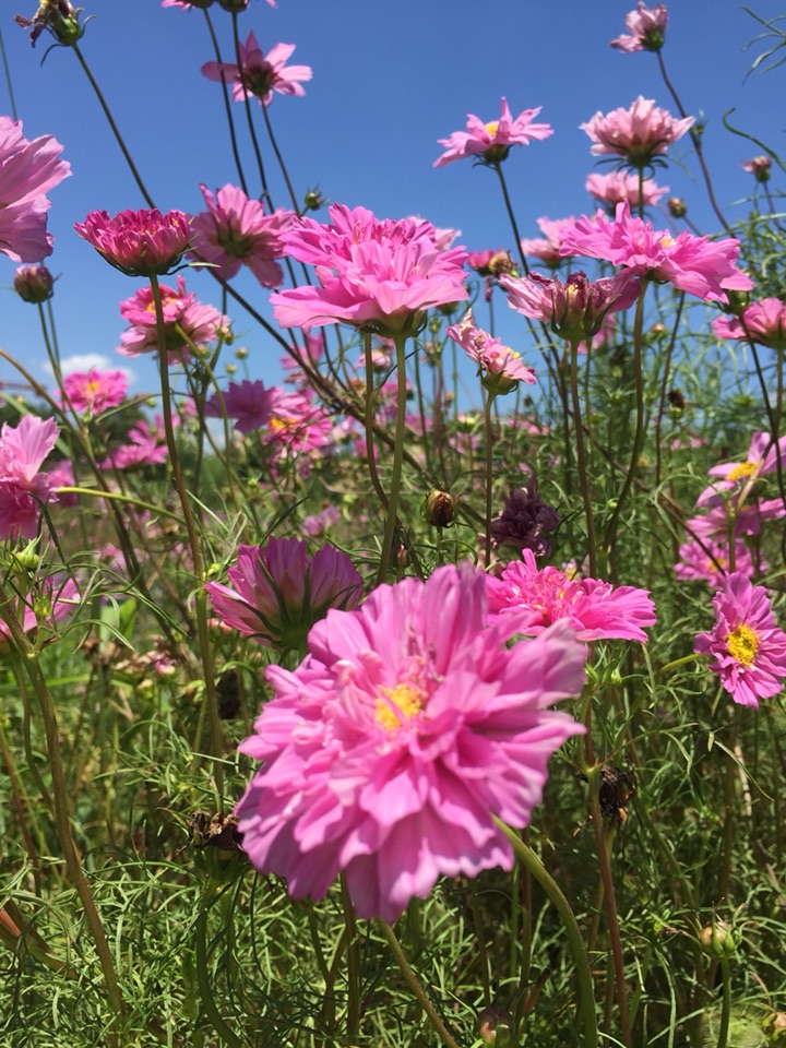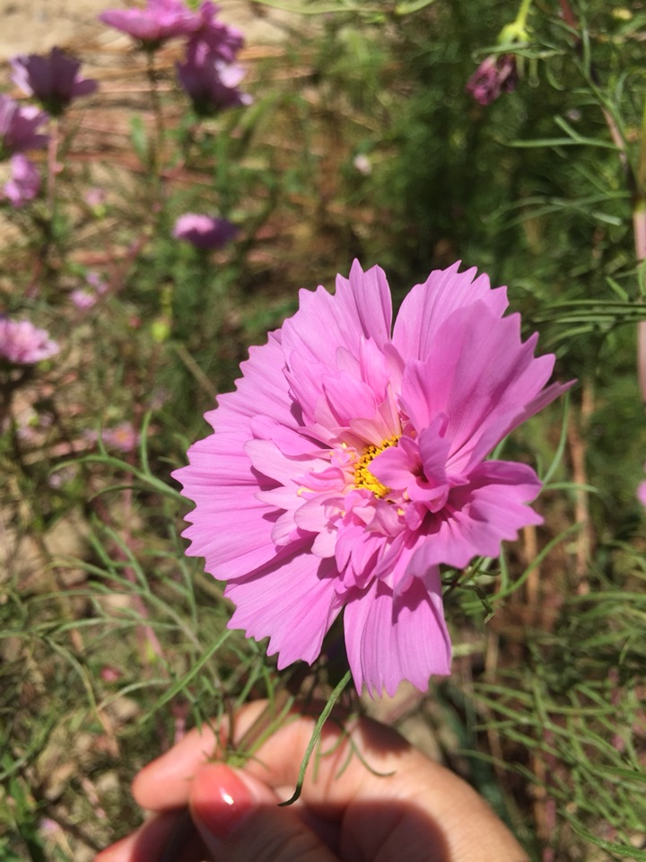 很喜欢,意外的遇见。可惜阳光太刺眼,不能慢慢享受。重瓣波斯菊,花朵不是很大,但花瓣层次丰富。