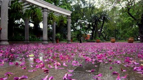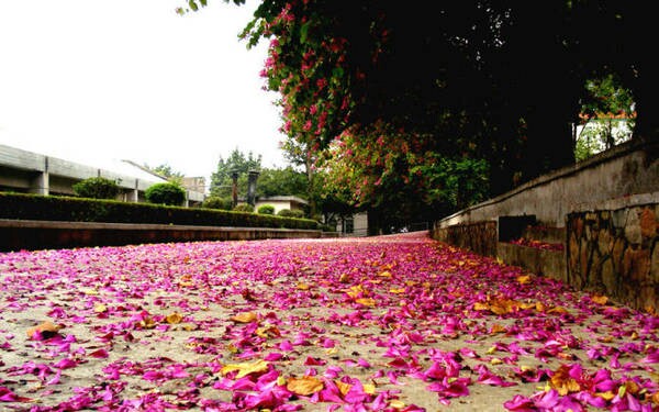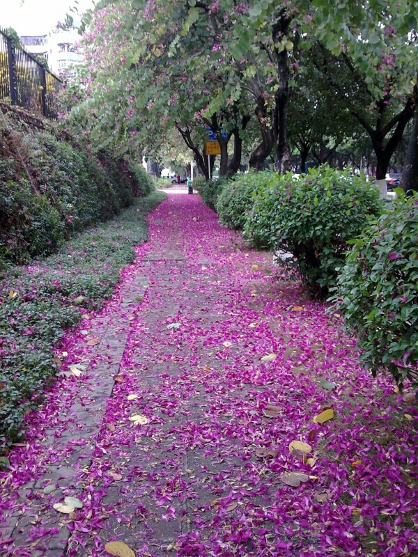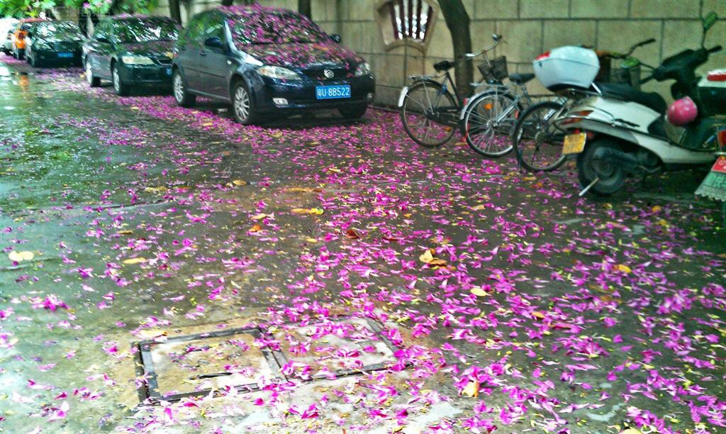下雨了,风起的时候,花儿簌簌地落了下来,落满一地。这场景让我想起那首歌:陪你去看花季,闭上眼睛呼吸,一直到落花下成雨。现在,我就真的看到了花瓣雨。