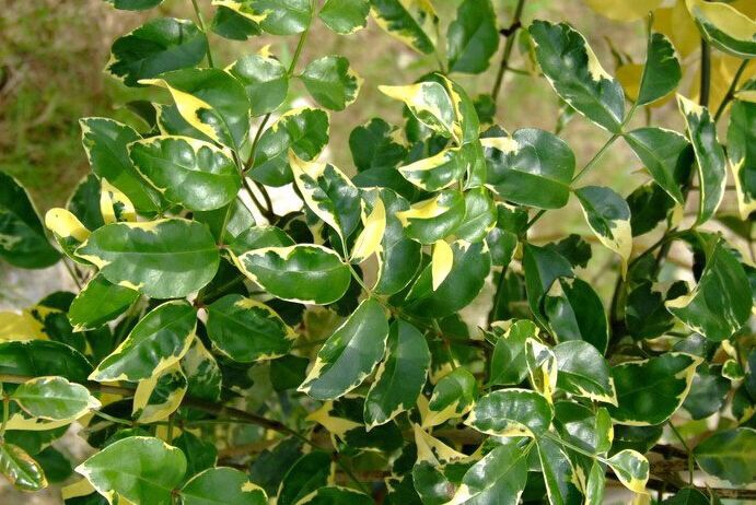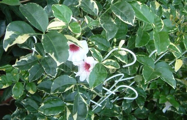斑叶粉花凌霄:常绿半蔓性灌木,株高40-60CM,奇数羽状复叶,小叶长椭圆形,革质,叶面有乳白色或乳黄色斑块,花冠钟形,白至淡粉红色,是粉花凌霄栽培变种,既观花又观叶。