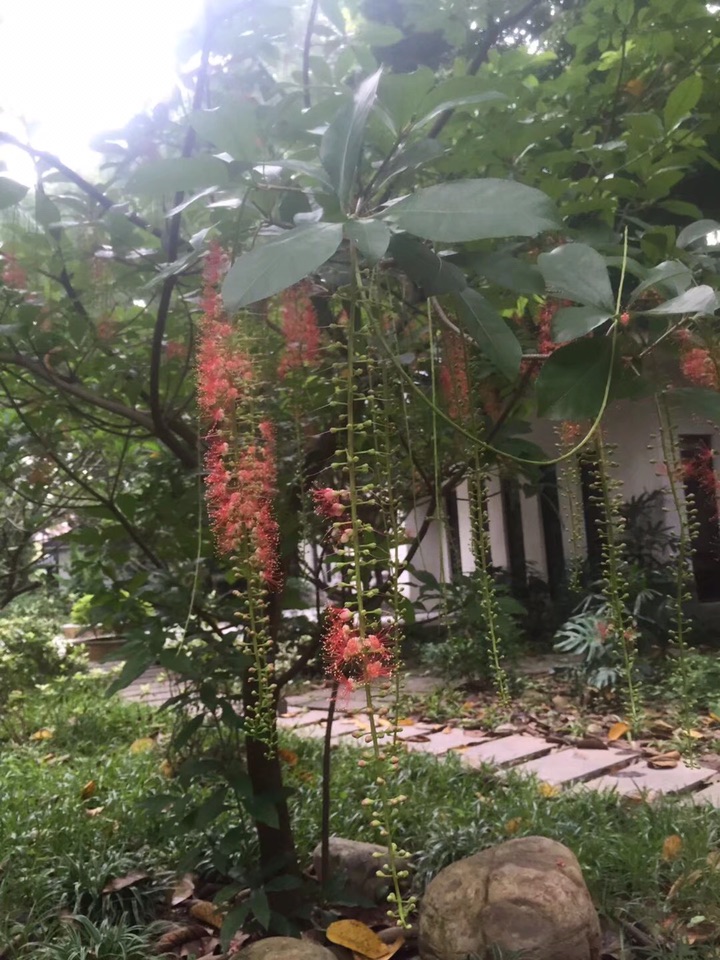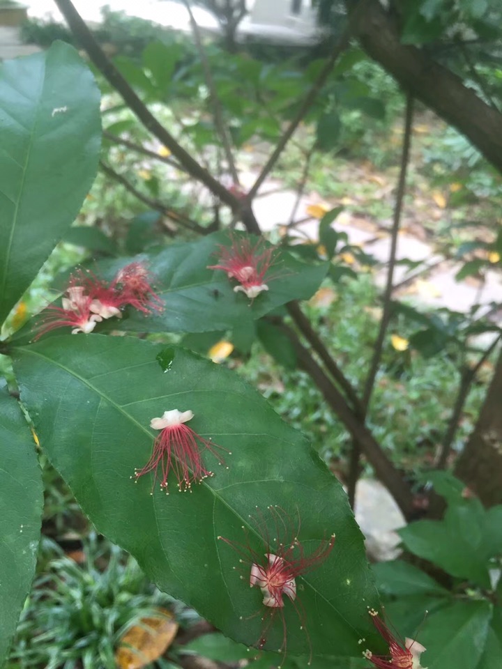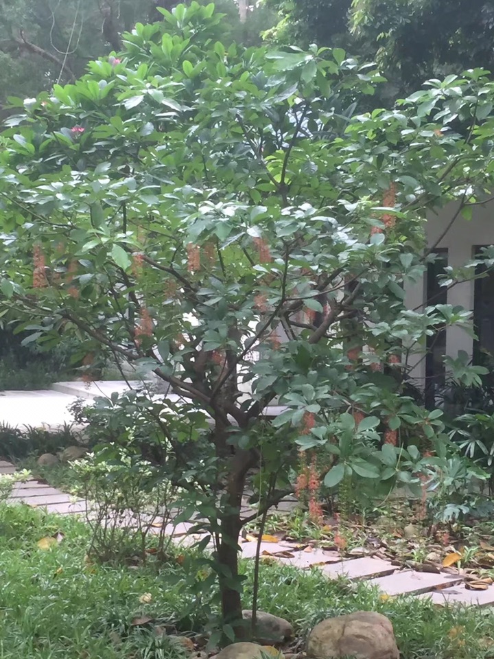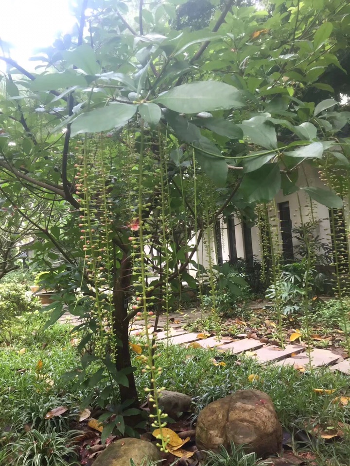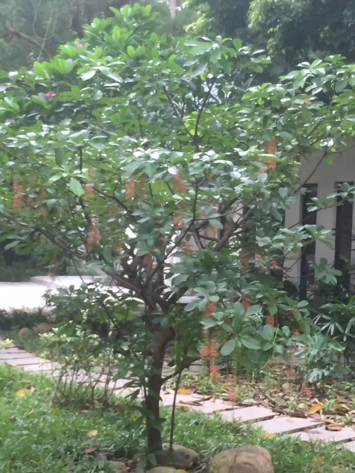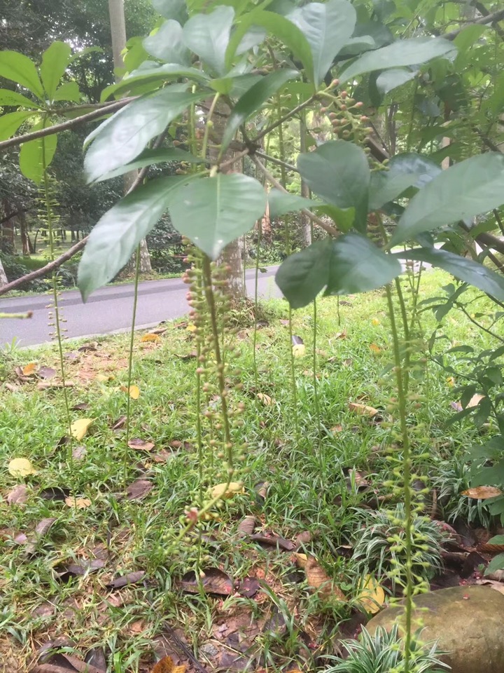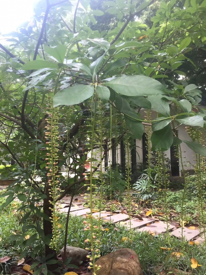 一棵有一米多高的树,特别的是从叶子旁垂下一串串的花序,旁边的叶子上有一些凋谢的花蕊。当时只觉得它有点特别,也没太在意,匆匆拍了几张就走了。