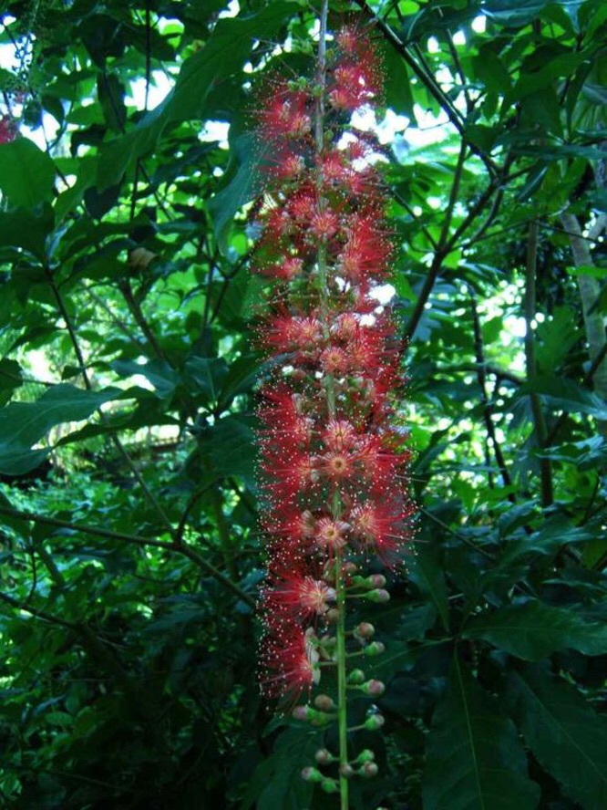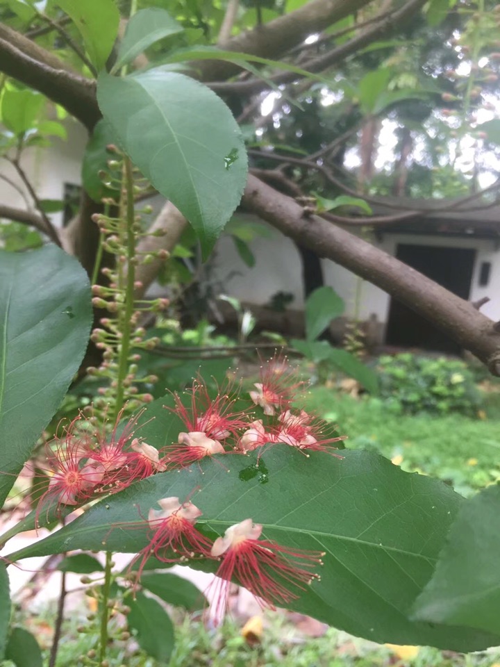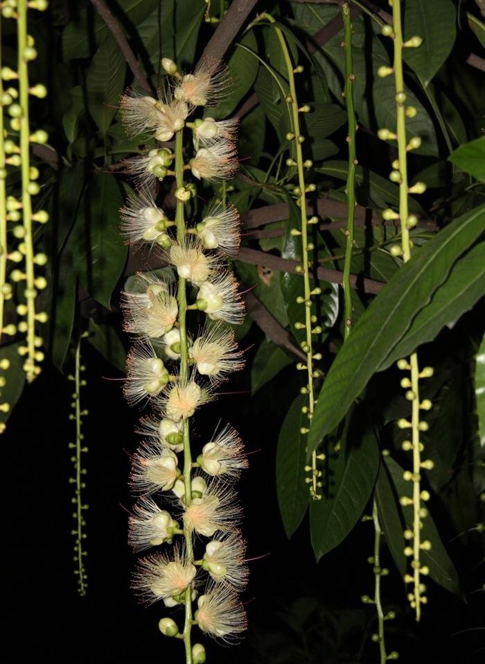 常绿乔木,叶大,长12~80厘米或更长,宽4~10厘米,倒卵形。螺旋状排列与枝顼状花序生于技顶,长达70厘米以上。花茎8~5厘米,疏生于总花序轴上,往往一个花序轴上的许多朵花同时开放,粉红色的花朵《主要是雄蕊的颜色》排成一长串,且有较淡的香味,非常吸引人。花期长,在热带地区几乎全年开花。在厦门花期长达半年以上(6-11个月),且花多,几乎每个枝条都有花芽。玉蕊的花有一个特点,晚间开放,白天闭合。粉红色的花朵在月光的映射下,悄然开放,给人一种“月下美人”的感受,更增添了神秘色彩。尤其适合于宾馆酒店摆设,在日本硫球群岛,玉蕊很受欢迎.其果实外面有一层很厚的纤维质的外果皮,质地轻,果实成 熟后能随水漂浮,从而完成种子的传播,这于人们熟知的椰子有些相同。