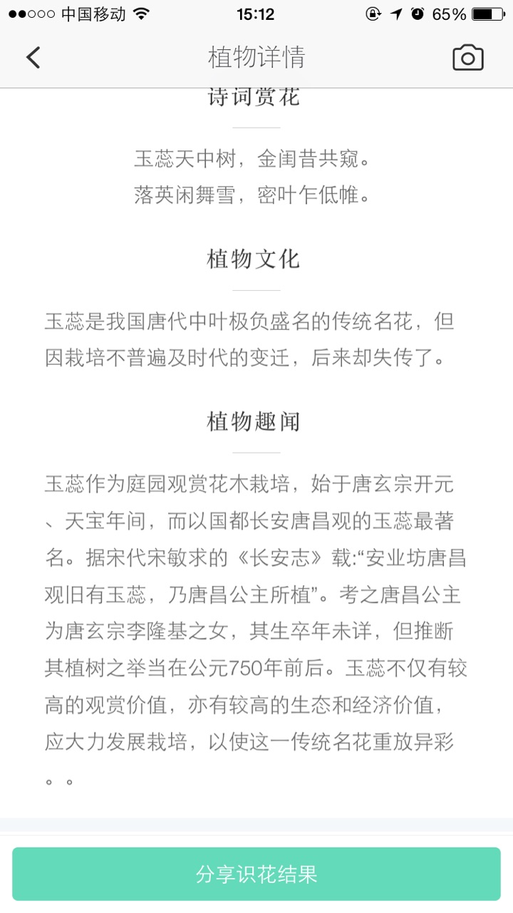好奇一打听,他们说这花叫玉蕊,是唐朝时的名花,后来却失传了。以下是拍照上传形色给出的资料: