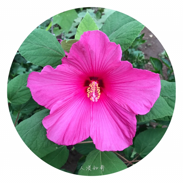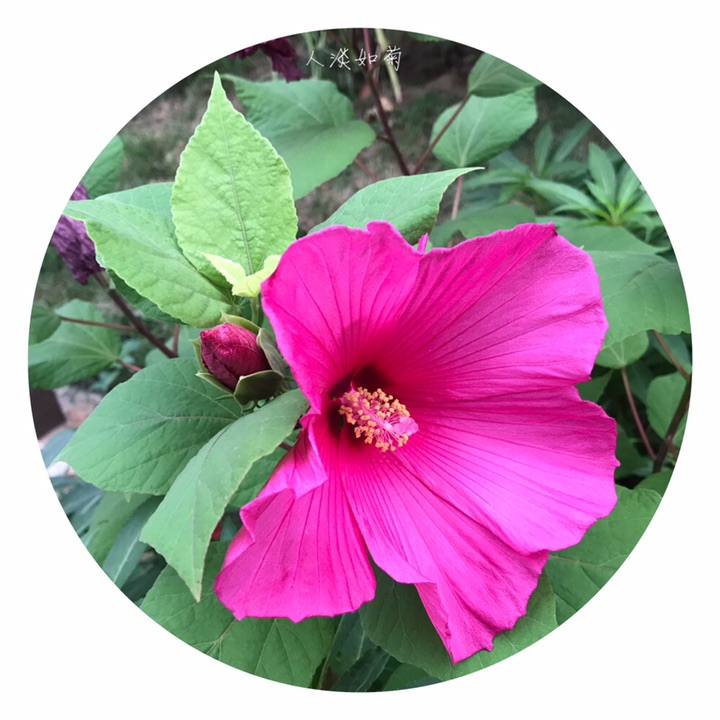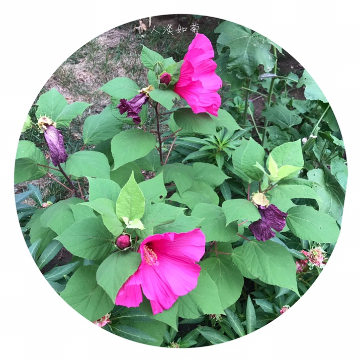 多年生草本,落叶灌木状。高1~2m,茎亚冠木桩,粗壮,丛生,斜出,光滑被白粉。单叶互生,叶长8~22cm,叶背及柄生灰色星状毛,叶形多变。基部圆形,缘具梳齿。花大,直径28cm,单生于叶腋,有白、粉、红、玫瑰红、紫等色,花萼宿存。花期6~9月。