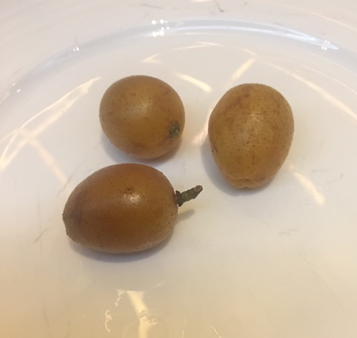 今天在酒店吃早饭的时候认识了一种新水果,外观、大小跟葡萄差不多,只是其棕黄色的皮略显粗糙,不如葡萄那样晶莹。