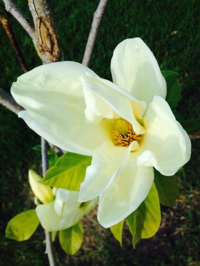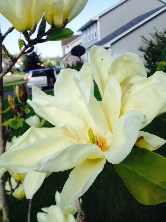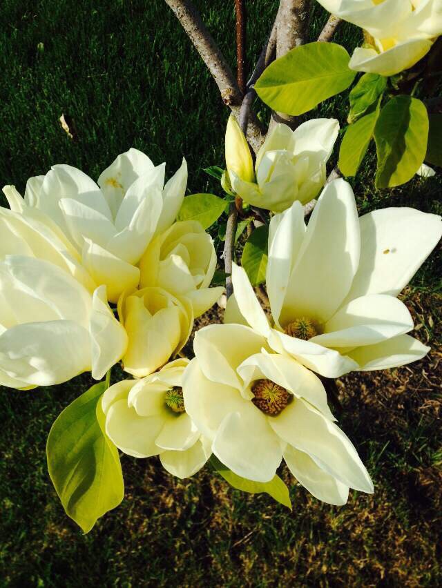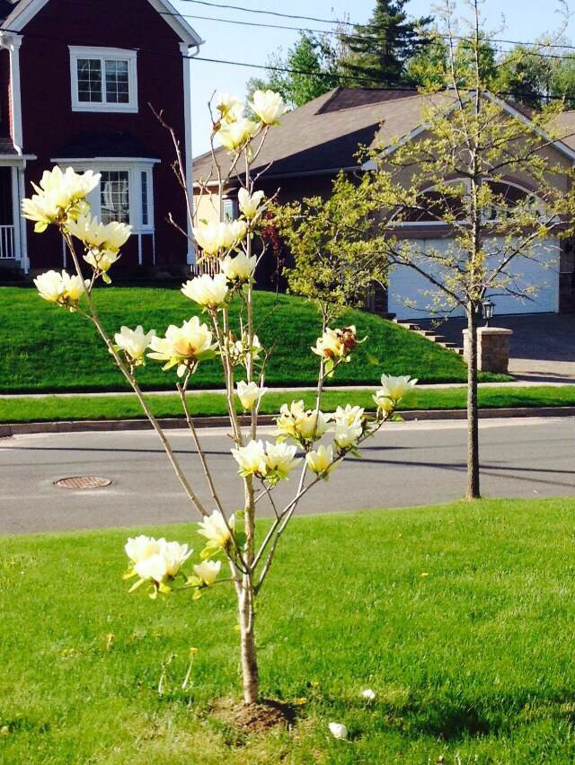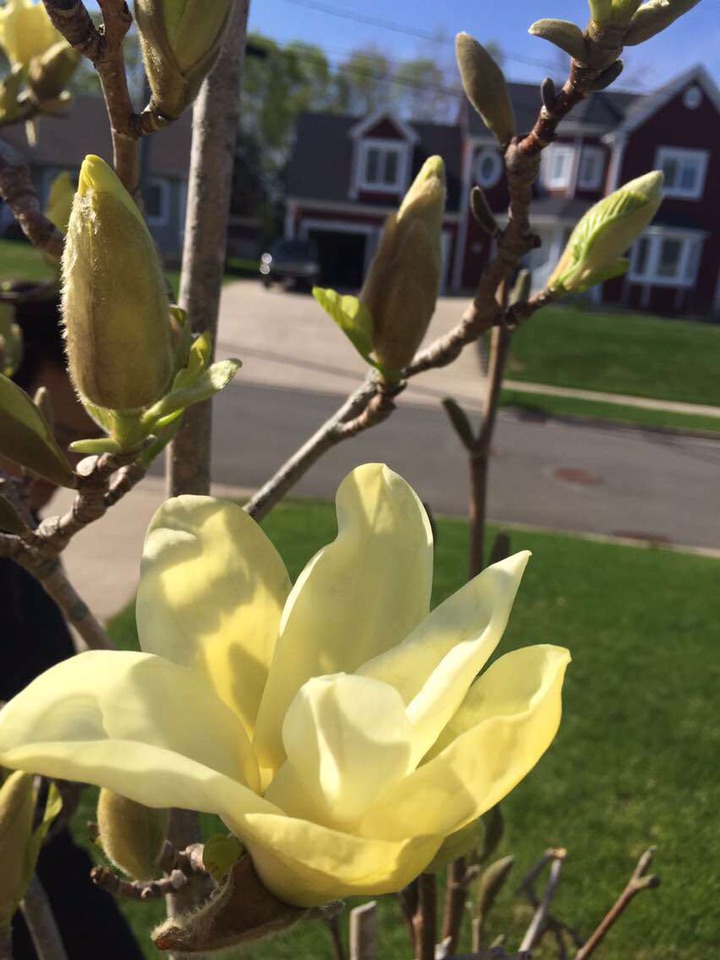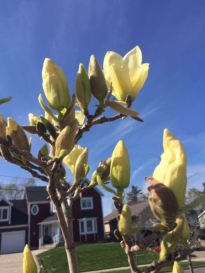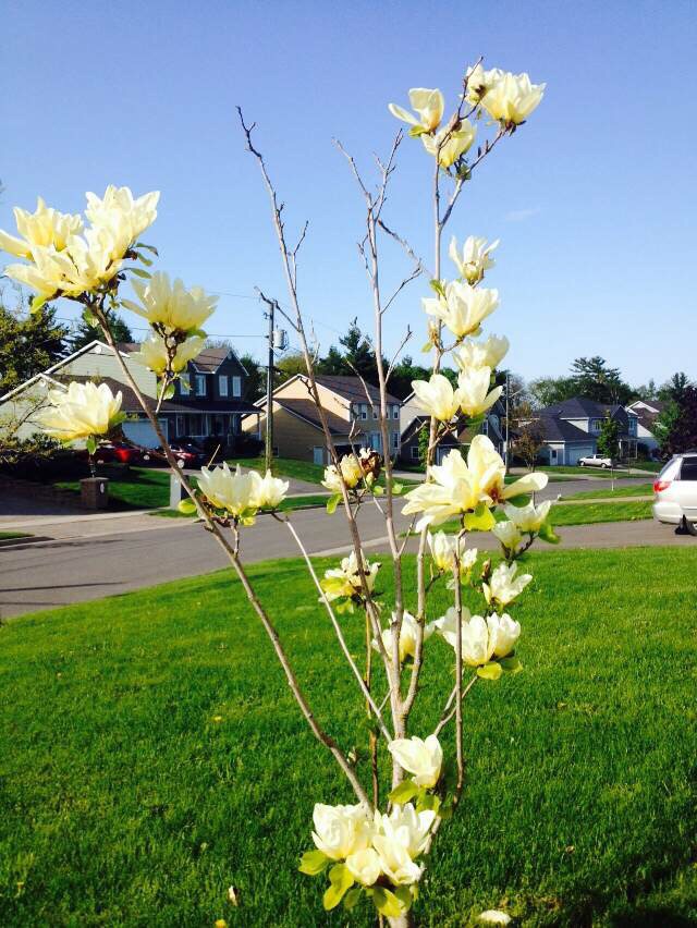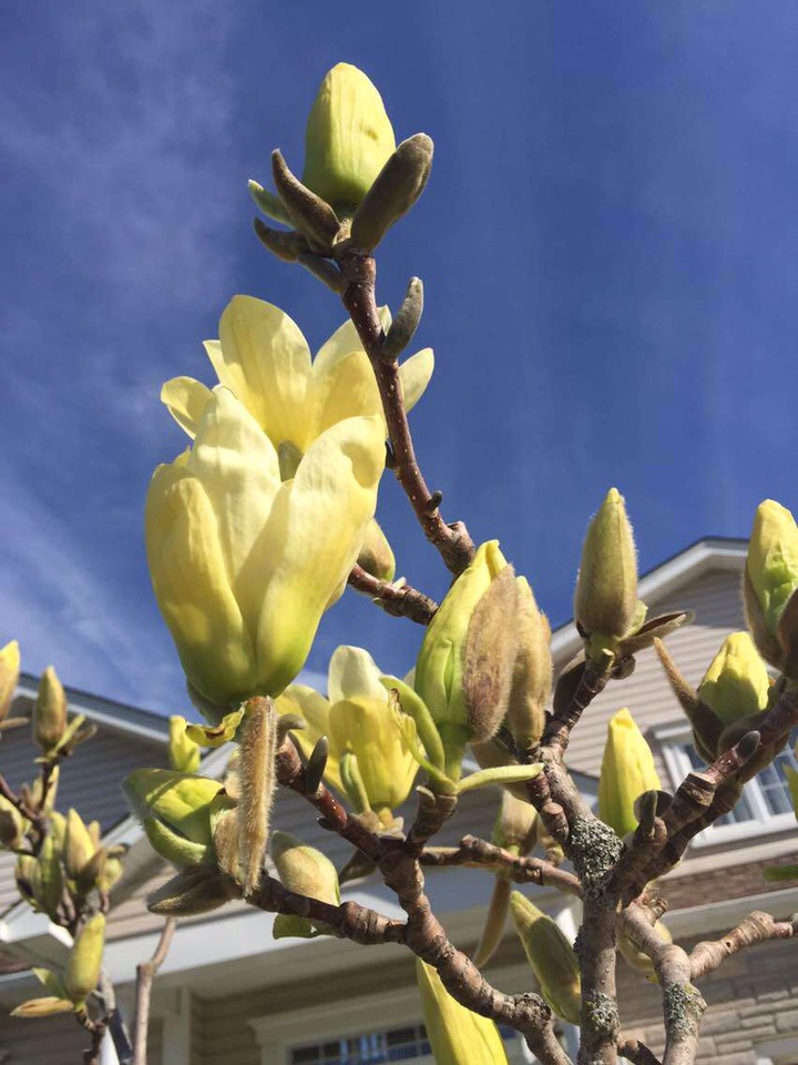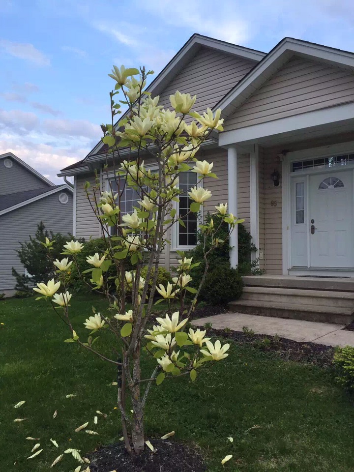这是一种最早出现的开黄色花朵的玉兰,1956年在Brooklyn Botanic Garden首次由cucumber tree和yulan magnolia杂交而成的。黄色花朵先于叶子而开,花期持续大概四周左右,随着花期渐渐往后,花色也渐渐变成奶白色,完全褪去刚开始的黄色,逐渐长出翠绿的叶子。开始那两年因为树太小怕受冻受寒风肆虐,每到入冬便在小树苗的四周搭上木架子用厚厚的麻布把她包裹好。后来树越长越健壮、也适应了寒冷的天气,所以到第四年就放养、接受大自然的拥抱了!
