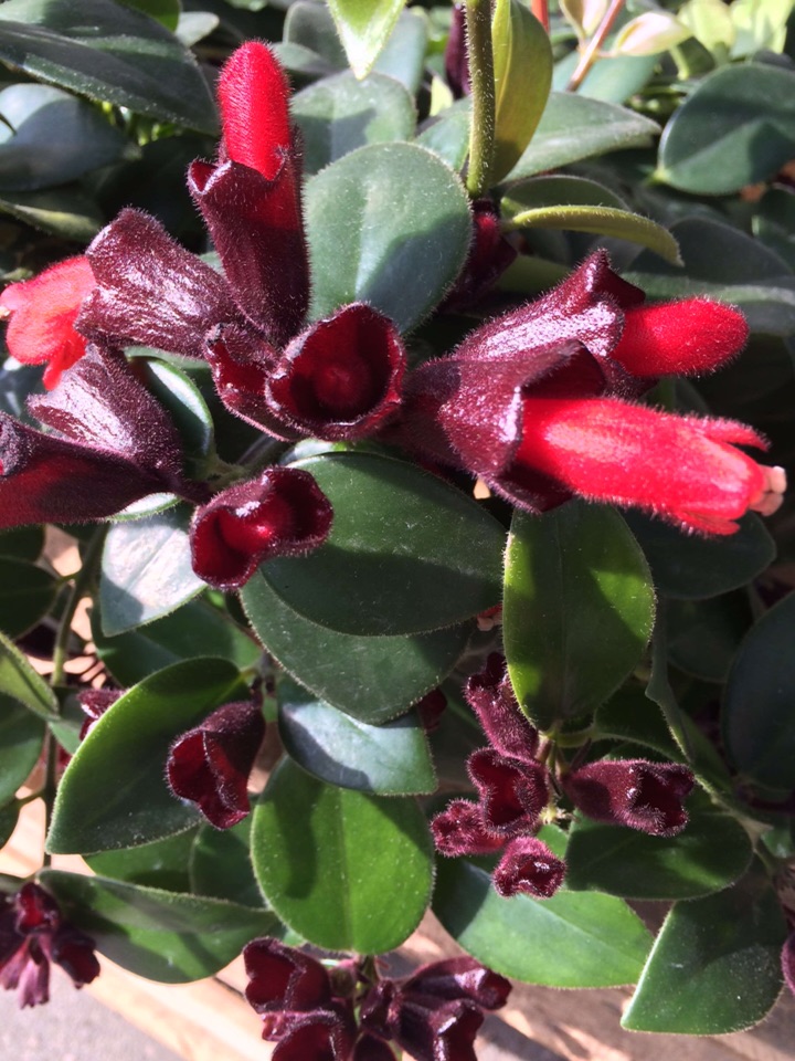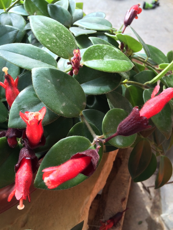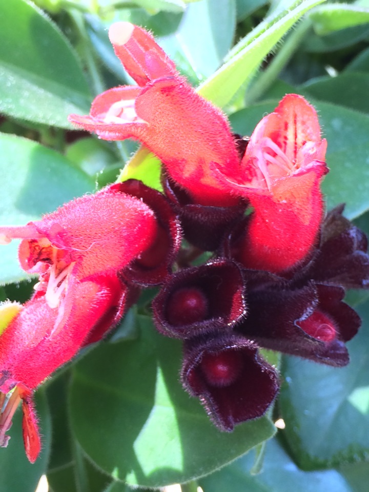 毛萼口红花植株蔓生,枝条下垂,叶对生,长卵形,全缘。花萼筒状,黑紫色披绒毛,花冠筒状,红色至红橙色,从花萼中伸出,尤如口红一般,非常形像,其花如名容易认识。
