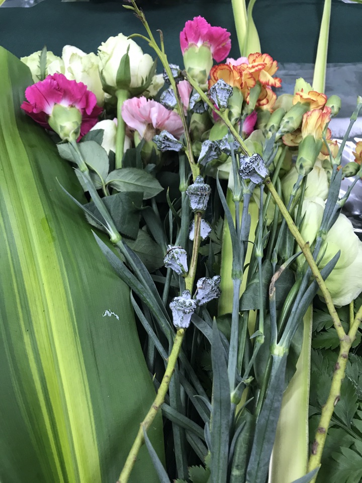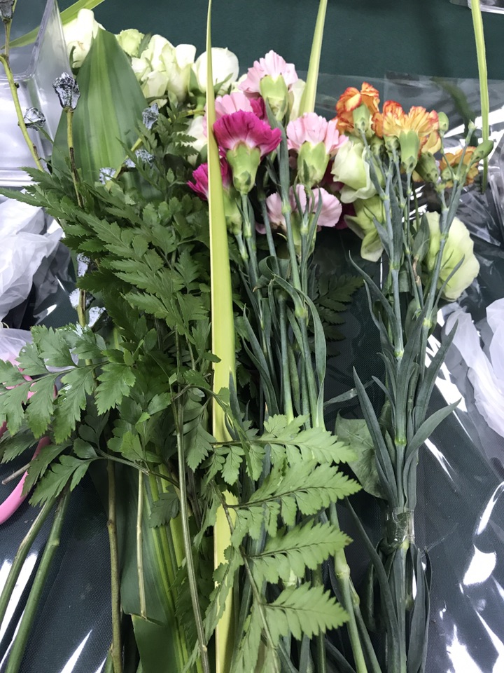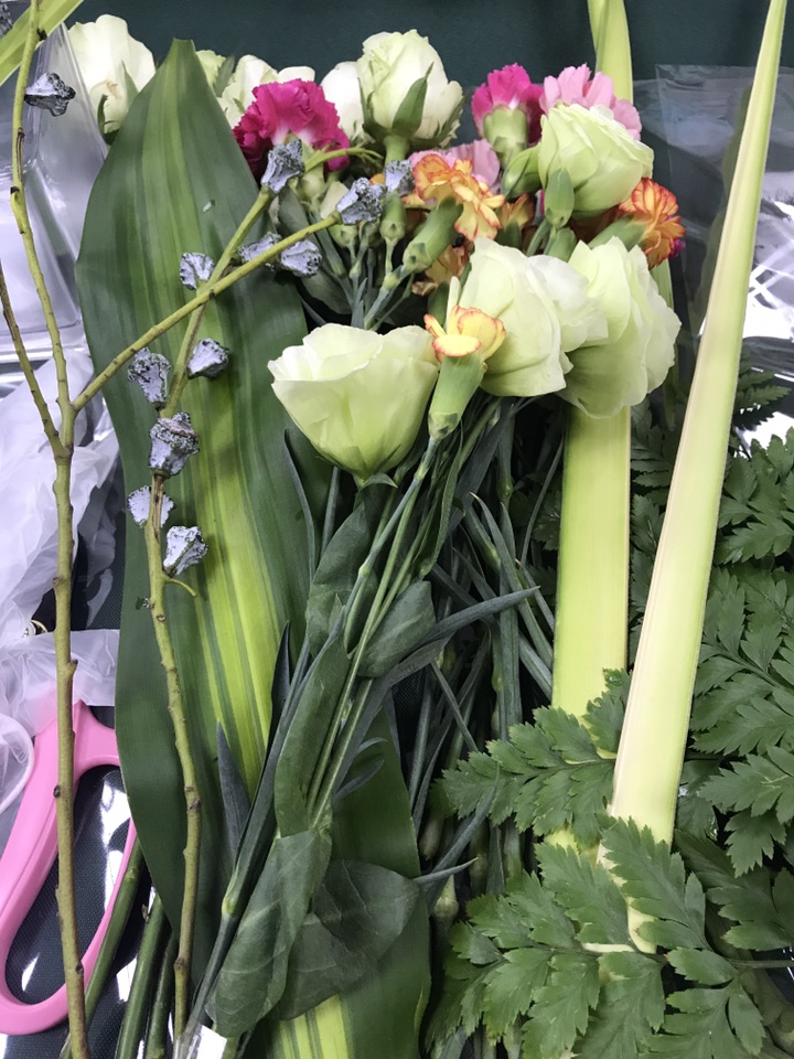 一上来老师便简单的给我们介绍了花艺的起源与发展还有类型与造型接着大概介绍了一下花材,有巴西木、洋桔梗、康乃馨、多头康乃馨、剑叶、尤加利果、高山羊齿、雪山玫瑰。这次的花材偏温馨,因为本次的主题是家庭插花,主花雪山玫瑰,模式三角型插花。三角型插花是西方花艺中的基础造型也是也是在现代的商业中应用最广泛的一种插花模式。