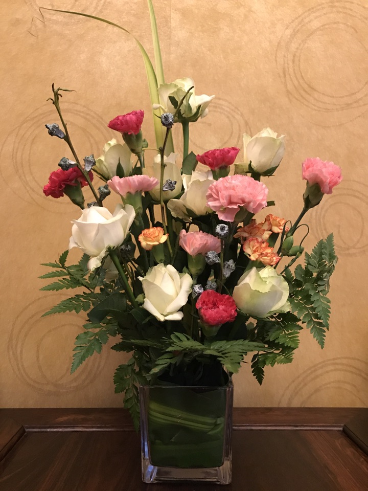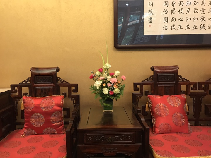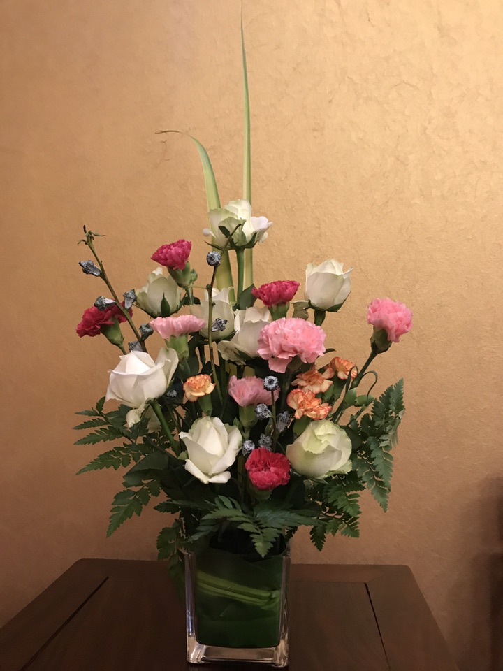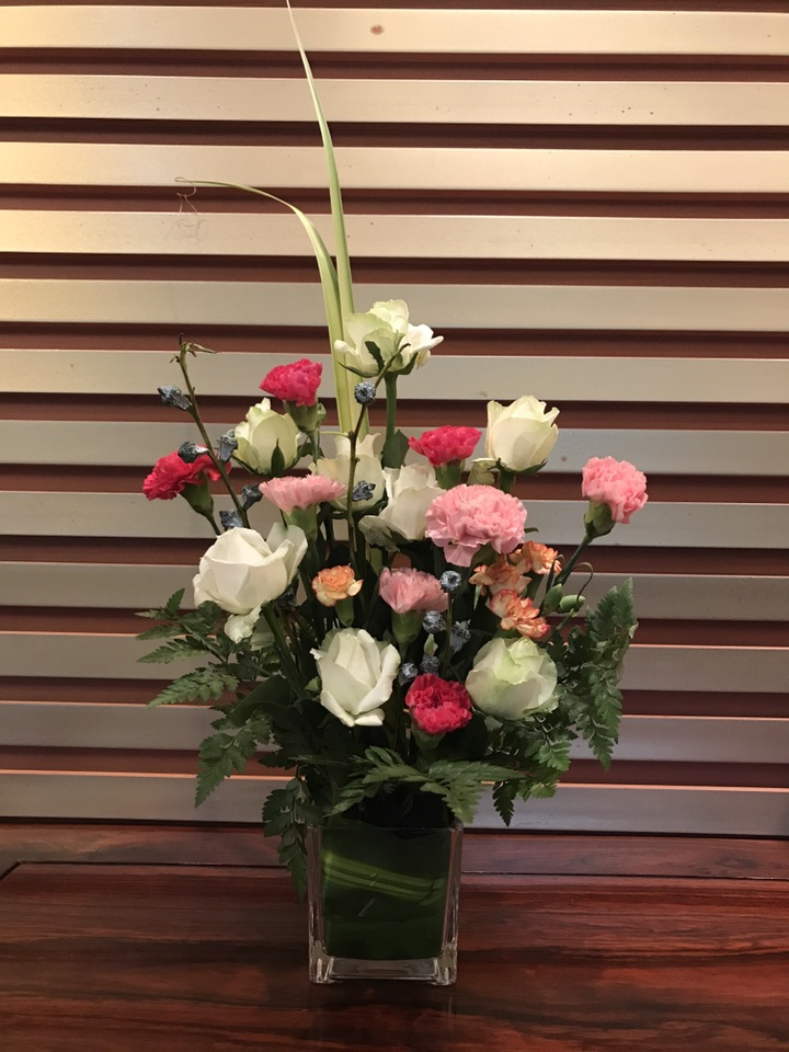 相对于上次的纯自由发挥,这次老师是一步一步的先给我们演示了一遍,该如何操作。这次的插花器皿是一个方形的玻璃缸,所以为了美观先用巴西木叶把花泥包裹起来然后再放入玻璃缸。接着用高山羊齿在玻璃缸的四周做好底托,然后根据自己的想法确立好想要的高度,接着正式的插花开始了……老师很有耐心的跟我们讲着每一个步骤,l直至一堆混乱的花材成了一道亮丽的风景,很遗憾,老师的插花我没有拍照,不然可以给花友们看看老师与菜鸟的天壤之别