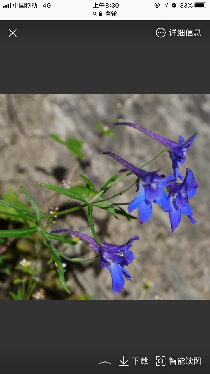 翠雀(学名:Delphinium grandiflorum L. ):为毛茛科、翠雀属多年生草本植物。因其花形别致,酷似一只只燕子,故又名飞燕草、鸽子花。花径4厘米左右。5-10月开花。形态优雅,惹人喜爱。原产于欧洲南部,中国分布在云南、山西、河北、宁夏、四川等地。是耐旱,阳性,耐半阴,性强健,耐寒,喜冷凉气候,生于山坡、草地、固定沙丘,忌炎热。