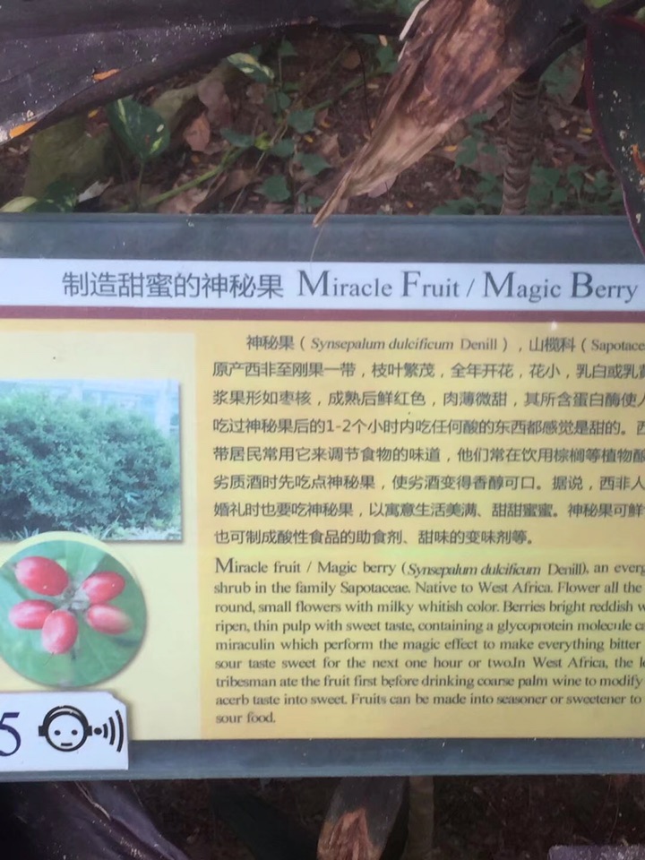 神秘果(学名:Synsepalum dulcificum Daniell)是山揽科神秘果属植物,典型热带常绿灌木,原产地在西非、加纳、刚果一带。20世纪60年代,周恩来总理到西非访问时,加纳共和国把神秘果作为国礼送给周总理。此后,神秘果开始在我国栽培。神秘果是一种国宝级的珍贵植物,不管是在西非各国还是我国,都受到保护,禁止出口。神秘果的果肉酸涩,但含有神秘果蛋白,吃了神秘果两小时内,接着吃其他酸性水果,会觉得这些酸水果不再是酸味,而变为甜味,故名神秘果。