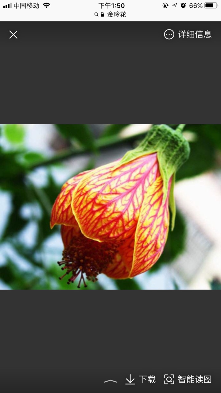金铃花(学名:Abutilon striatum),又名灯笼花、网花苘麻、红脉商麻,属于常绿灌木,由于叶片常绿、花形独特、花期较长、易于繁殖,颇受喜爱。金铃花系丛生,茎直立,叶翠绿,质厚,卵状,亦有掌状,边缘有锯齿,花梗细长,小蕾期向上,随着蕾的膨大逐渐向下,开花特别下垂,花钟形,橙黄色,上有鲜艳的紫红色脉纹,花蕊和花柱较长,伸出花冠之外,整花如吊着的金色铃子而得名。喜温暖及阳光充足,不耐寒,稍耐阴;宜肥沃、湿润而排水良好的砂壤土。原产南美洲的巴西、乌拉圭等地,中国西南等地有栽培,供园林观赏用。